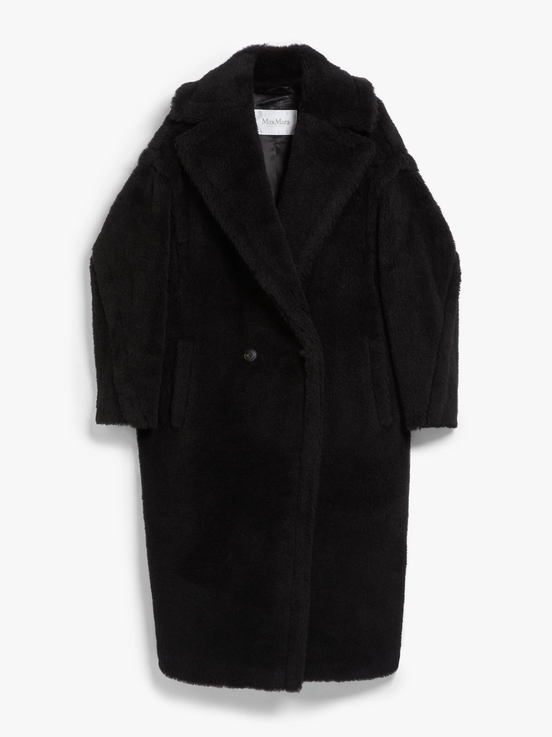 DETAILS The 2013-designed Teddy Bear Coat is inspired by an '80s archive piece and immediately became an it-coat, loved by stars and influencers alike, thanks to its perfect alchemic concoction of glamour and playfulness. Its special fabric is the result of a sophisticated technology, developed by the creative team alongside an Italian supplier, which is able to produce a unique faux fur. The coat's exuberant volume is an ode to the fabric's opulent extravagance. Made from alpaca and wool fabric, set on a silk base Oversized fit Lapel collar Low set-in sleeves Horizontal-welt pockets Double-breasted fastening Branded lining Horn buttons Length: 110 cm/4.3 inches COMPOSITION AND CARE Jersey fabric 62% alpaca, 26% virgin wool, 12% silk; lining 100% viscose. Do not wash; do not bleach; do not tumble dry; do not iron; professionally dry clean perchloroethylene - mild process; do not wet clean.; protect buttons before washing.; contains non-textile parts of animal origin. Distributed by Max Mara S.r.l., registered office in Reggio Emilia (Italy), Via Giulia Maramotti 4, 42124 (IT)