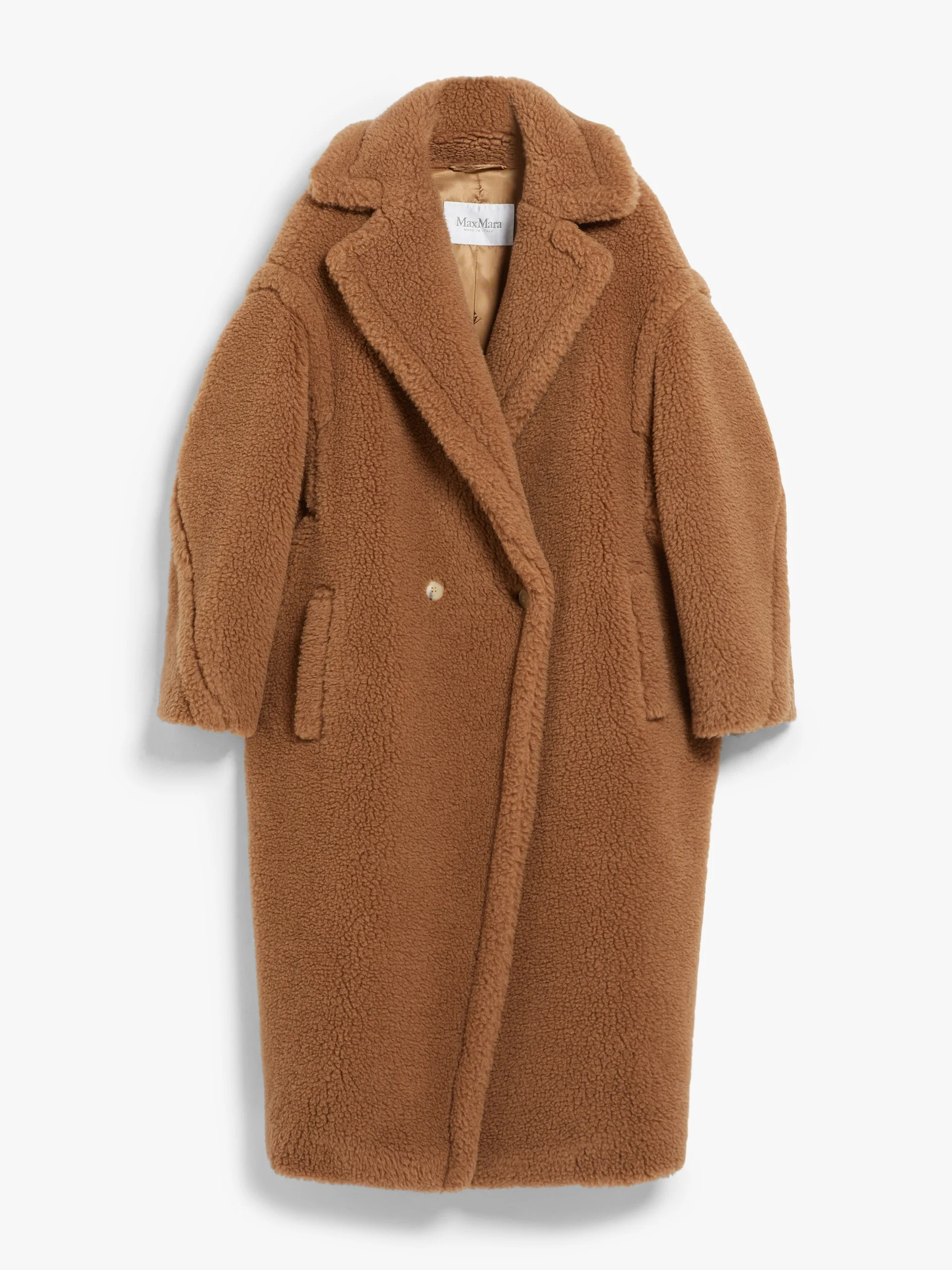 DETAILS The 2013-designed Teddy Bear Coat is inspired by an '80s archive piece and immediately became an it-coat, loved by stars and influencers alike, thanks to its perfect alchemic concoction of glamour and playfulness. Its special fabric is the result of a sophisticated technology, developed by the creative team alongside an Italian supplier, which is able to produce a unique faux fur. The coat's exuberant volume is an ode to the fabric's opulent extravagance. Made from camel fabric, set on a silk base Oversized fit Lapel collar Low set-in sleeves Horizontal-welt pockets Double-breasted fastening Branded lining Horn buttons Length: 110 cm/4.3 inches COMPOSITION AND CARE Jersey fabric 88% camelwool, 12% silk; lining 100% viscose. Do not wash; do not bleach; do not tumble dry; do not iron; professionally dry clean perchloroethylene - mild process; do not wet clean.; protect buttons before washing.; contains non-textile parts of animal origin. Distributed by Max Mara S.r.l., registered office in Reggio Emilia (Italy), Via Giulia Maramotti 4, 42124 (IT)