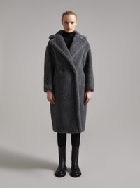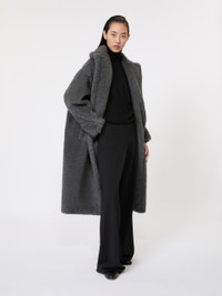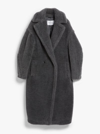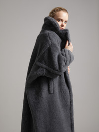DETAILS Designed in 2013, the Teddy Bear Coat was inspired by an archival garment from the ’80s and immediately became an it-coat. Stars and influencers loved its perfect alchemic blend of glamour and playfulness. Its distinctive texture is created using advanced technology, developed by our creative team in collaboration with an Italian supplier, to create a one-of-a-kind faux fur. The coat's abundant volume is a celebration of the opulent extravagance of this fabric. Made of wool and alpaca on a silk base Oversized fit Lapel collar Low-set sleeves Horizontal welt pockets Double-breasted closure Branded lining Horn buttons Length: 110 cm / 43 inches COMPOSITION AND CARE Jersey fabric 44% virgin wool, 44% alpaca, 12% silk; lining 100% viscose. Do not wash; do not bleach; do not tumble dry; do not iron; professionally dry clean perchloroethylene - mild process; do not wet clean.; protect buttons before washing.; contains non-textile parts of animal origin. Distributed by Max Mara S.r.l., registered office in Reggio Emilia (Italy), Via Giulia Maramotti 4, 42124 (IT)