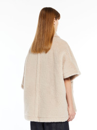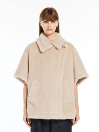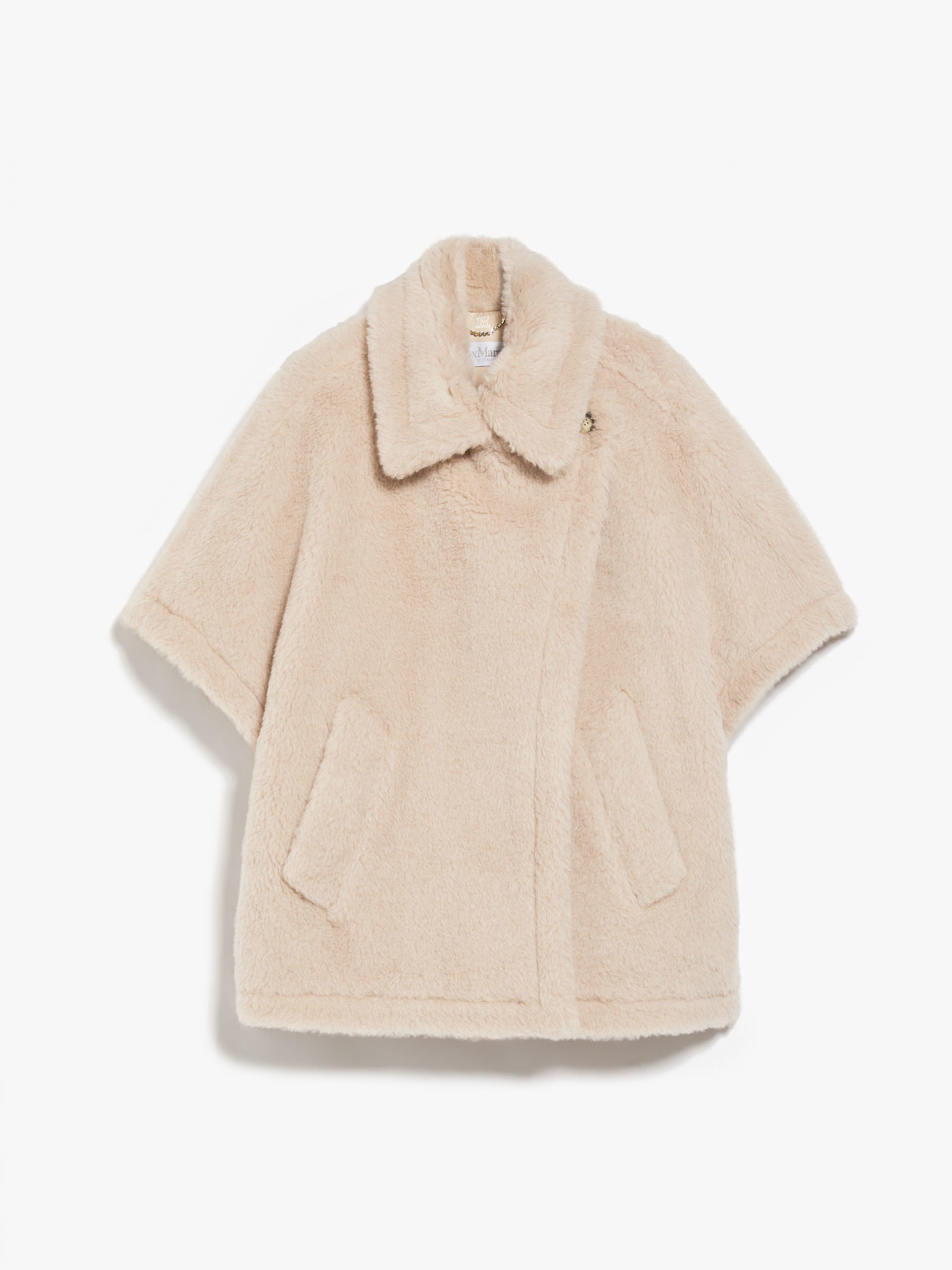 DETAILS Short cape in iconic alpaca and wool Teddy fabric, set on a silk base. The wraparound model boasts a maxi pointed collar, loose-fitting short sleeves and slanted welt pockets. Viscose lining and an asymmetrical one-button fastening. COMPOSITION AND CARE Jersey fabric 62% alpaca, 26% virgin wool, 12% silk; lining 100% viscose. Do not wash; do not bleach; do not tumble dry; do not iron; professionally dry clean perchloroethylene - mild process; do not wet clean. Distributed by Max Mara S.r.l., registered office in Reggio Emilia (Italy), Via Giulia Maramotti 4, 42124 (IT)