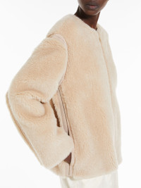 DETAILS New Teddy jacket made of iconic alpaca and wool fabric on a silk base. Crew-neck design with characteristic cardigan-style wearability, finished with on-tone grosgrain appliqués and pockets inserted on the sides. Metal zip fastening on the front. COMPOSITION AND CARE Jersey fabric 62% alpaca, 26% virgin wool, 12% silk; lining 100% polyester; decorations in 55% cotton, 45% viscose. Do not wash; do not bleach; do not tumble dry; do not iron; professionally dry clean perchloroethylene - mild process; do not wet clean.; wash the garment while it is fastened.; protect zipper tongue and slide before cleaning.; turn the articles inside out before washing. Distributed by Max Mara S.r.l., registered office in Reggio Emilia (Italy), Via Giulia Maramotti 4, 42124 (IT)