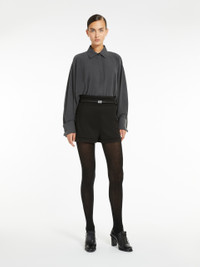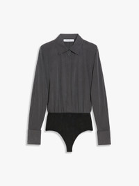 DETAILS Wrap over shirt in an exquisite pure silk melange fabric featuring a particular construction with ample volume on the back and covered shoulder pads matching the garment. Long raglan sleeves with French cuff fastening. The bodysuit detail on the lower section allows for a comfortable and perfect fit at the waist. COMPOSITION AND CARE Fabric 100% silk; with knitted details 94% polyamide, 6% elastane. Do not wash; do not bleach; do not tumble dry; cool iron; professionally dry clean perchloroethylene - mild process; do not wet clean.; remove the cufflinks before washing.; iron with a cloth between.; contains non-textile parts of animal origin. Distributed by Max Mara S.r.l., registered office in Reggio Emilia (Italy), Via Giulia Maramotti 4, 42124 (IT)
