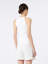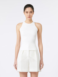 DETAILS Sleeveless top featuring a silhouette-accentuating rib-knit pattern. Stretch technical viscose yarn top Slim fit Halterneck design COMPOSITION AND CARE 83% viscose, 17% polyester. Hand wash cold (40°c max); do not bleach; do not tumble dry; flat drying in the shade; cool iron; professionally dry clean perchloroethylene - mild process; do not wet clean.; iron with a cloth between.; using neutral detergent. Distributed by Max Mara S.r.l., registered office in Reggio Emilia (Italy), Via Giulia Maramotti 4, 42124 (IT)