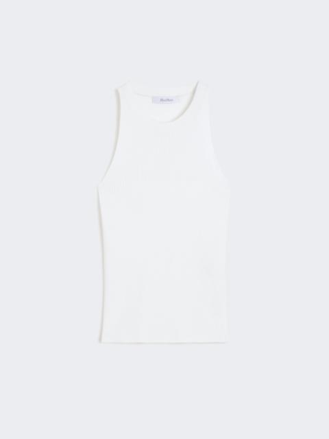 DETAILS Sleeveless top featuring a silhouette-accentuating rib-knit pattern. Stretch technical viscose yarn top Slim fit Halterneck design COMPOSITION AND CARE 83% viscose, 17% polyester. Hand wash cold (40°c max); do not bleach; do not tumble dry; flat drying in the shade; cool iron; professionally dry clean perchloroethylene - mild process; do not wet clean.; iron with a cloth between.; using neutral detergent. Distributed by Max Mara S.r.l., registered office in Reggio Emilia (Italy), Via Giulia Maramotti 4, 42124 (IT)