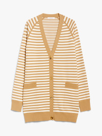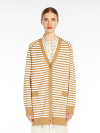 DETAILS Long cardigan with an oversized fit, made of viscose crêpe yarn and embellished with an all-over jacquard pattern. The garment features a V neck, patch pockets on the front and long raglan sleeves. Finished with ribbed edges and fastened with horn buttons. COMPOSITION AND CARE 62% viscose, 38% polyester. Hand wash cold; do not bleach; do not tumble dry; flat drying in the shade; cool iron; professionally dry clean perchloroethylene - mild process; do not wet clean.; iron with a cloth between.; using neutral detergent. Distributed by Max Mara S.r.l., registered office in Reggio Emilia (Italy), Via Giulia Maramotti 4, 42124 (IT)