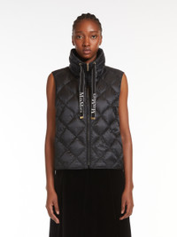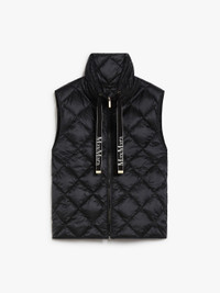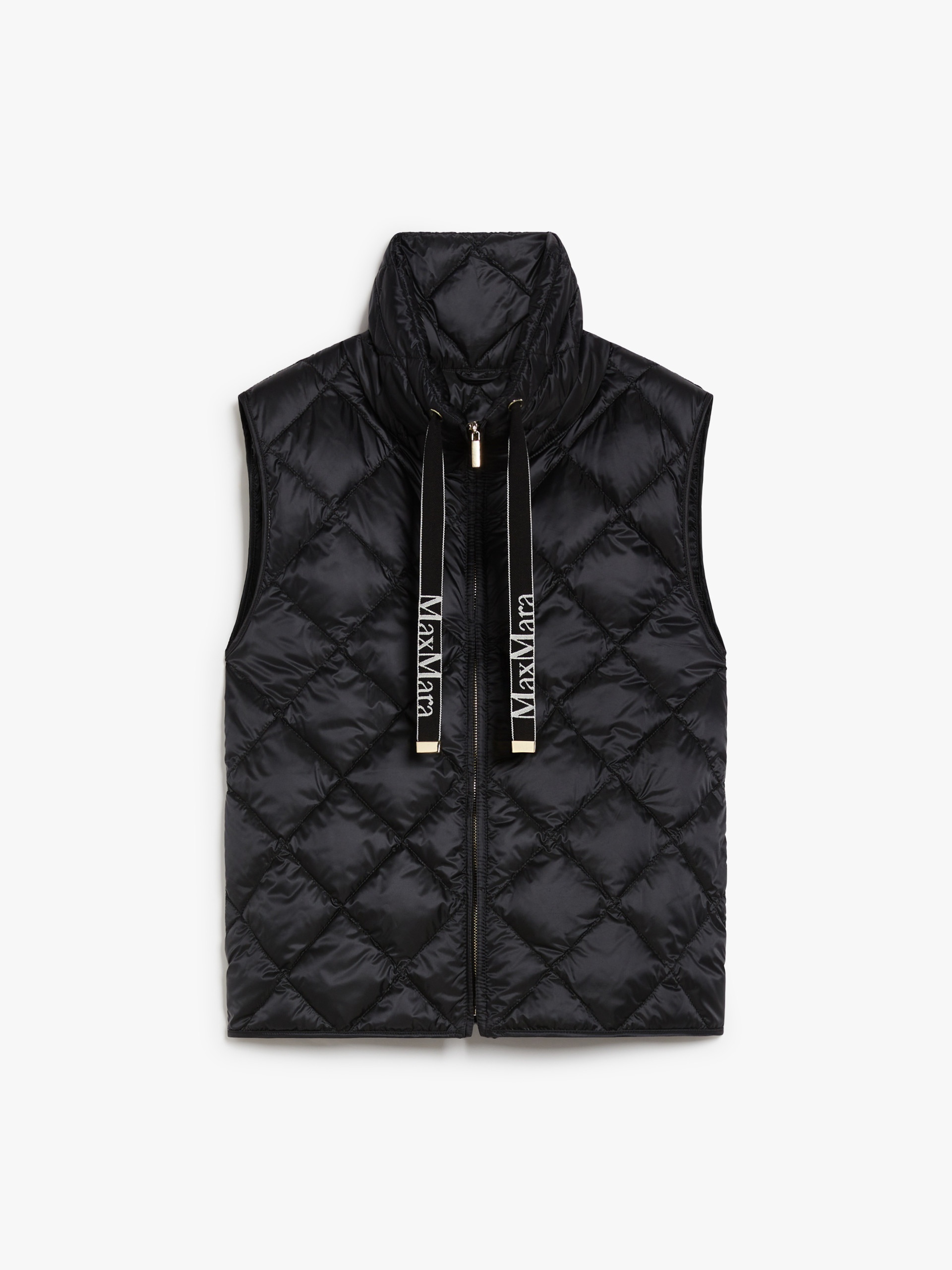 DETAILS Short, goose-down gilet made of iridescent water-repellent technical canvas with a diamond quilted pattern. The style features a high neck with a jacquard logo tape drawstring, and side welt pockets. This style comes with a Cube Bag that is handy for travelling. Front fastening with metal zip running top-to-bottom and on the collar. COMPOSITION AND CARE Fabric 100% polyamide; lining 100% polyamide; - exclusive of decoration; with quilting virgin goose-down; care case 100% polyamide. Do not wash; do not bleach; do not tumble dry; cool iron; professionally dry clean perchloroethylene - mild process; do not wet clean.; wash the garment while it is fastened.; don’t iron the labels.; protect the ends stoppers and/or the cord ends before washing.; turn the articles inside out before washing.; contains non-textile parts of animal origin. Distributed by Max Mara S.r.l., registered office in Reggio Emilia (Italy), Via Giulia Maramotti 4, 42124 (IT)