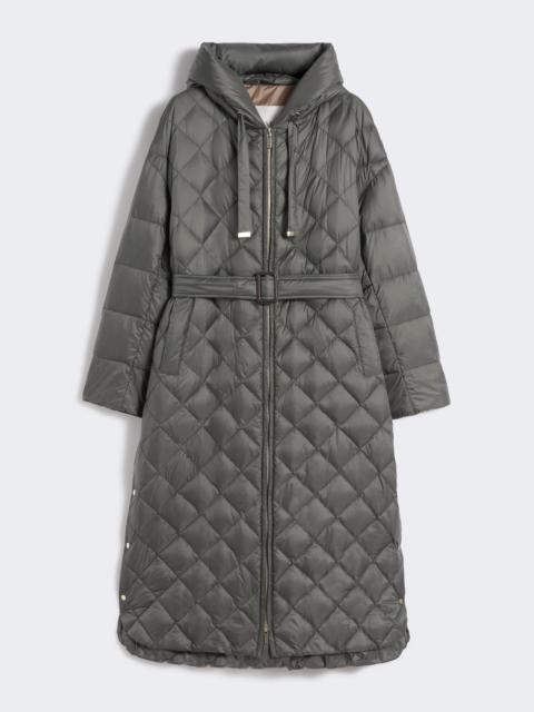 DETAILS Long down jacket featuring a straight silhouette with deep rounded side slits which can be opened with logo snap buttons. Water-repellent, nylon canvas diamond-quilted down jacket Drawstring hood Long sleeves quilted with horizontal stripes and dropped shoulders Front fastening with double slider zip Welt pockets on the sides Belt with buckle, removable with horn buttons on the back Goose-down padding COMPOSITION AND CARE Fabric 100% polyamide; lining 100% polyamide; with quilting virgin goose-down. Machine wash cold delicate cycle; do not bleach; do not tumble dry; line drying in the shade; cool iron; professionally dry clean perchloroethylene - mild process.; wash the garment while it is fastened.; wash the belt in a net sack.; do not iron the buttons.; protect buttons before washing.; protect the ends stoppers and/or the cord ends before washing.; turn the articles inside out before washing.; remove the buckle before washing.; contains non-textile parts of animal origin. Distributed by Max Mara S.r.l., registered office in Reggio Emilia (Italy), Via Giulia Maramotti 4, 42124 (IT)