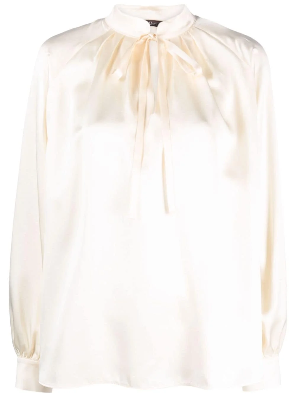 tie-fastening silk blouse Highlights - Ivory white - Silk - Satin finish - Band collar - Front tie fastening - Long sleeves - Buttoned-cuff sleeves - Straight hem Made in Italy Composition Silk 100% SIZE & FIT Model measurements Height 5 ft 10 in(1.78 m) Bust/Chest 31.49 in(80 cm) Hips 37 in(94 cm) Waist 23.62 in(60 cm) FittingInformation Designed to be unstructured, offering a loose fit throughout Made from a midweight non-stretch fabric This piece fits true to size – take your usual size Washing instructions Dry Clean Only