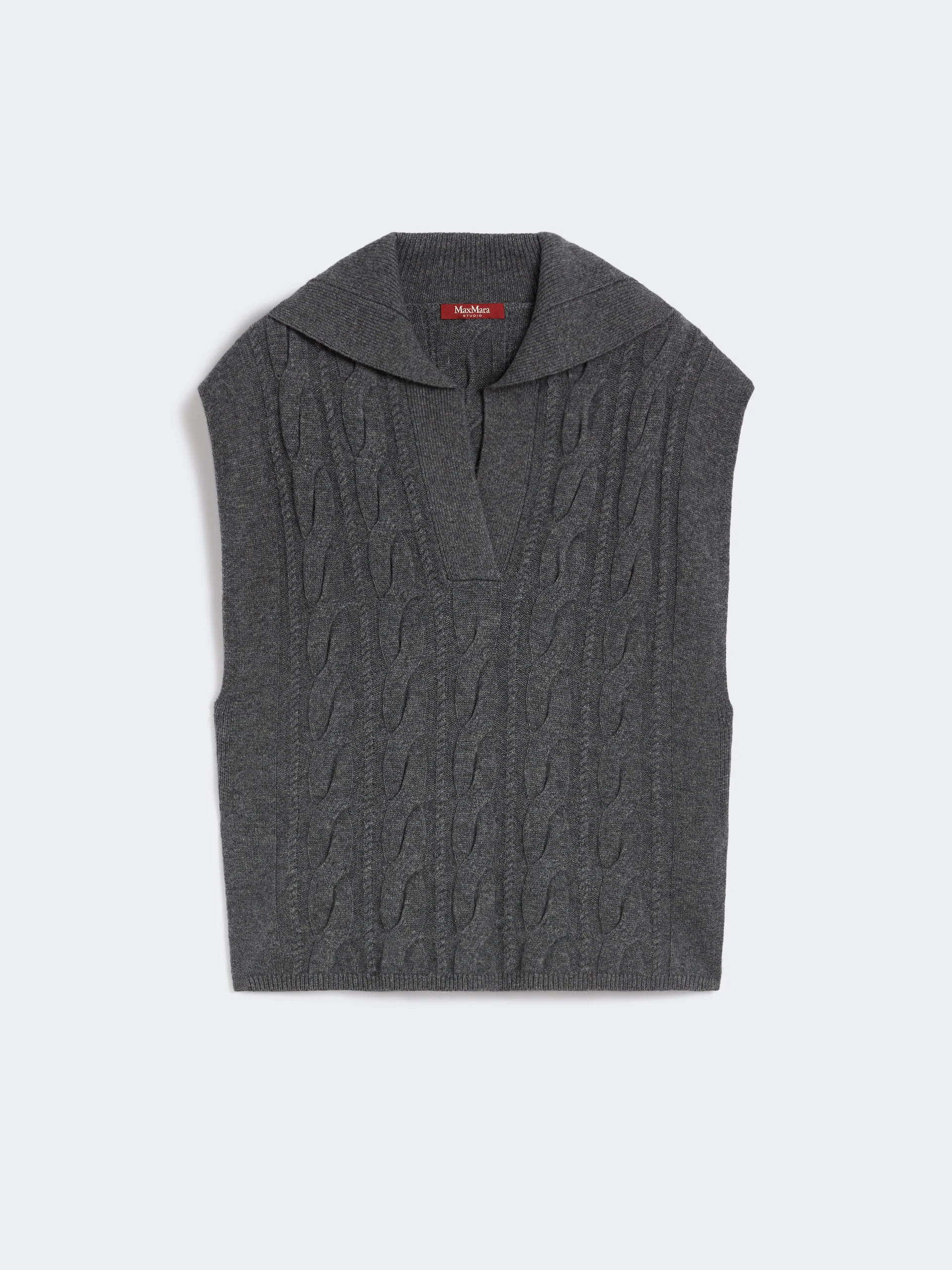 DETAILS Gilet with all-over vertical cable pattern. Wool and cashmere yarn gilet Relaxed fit Wide armhole High polo-neck collar which rests on the shoulders Dropped shoulders Side slits COMPOSITION AND CARE 80% wool, 20% cashmere. Hand wash cold; do not bleach; do not tumble dry; flat drying in the shade; cool iron; professionally dry clean perchloroethylene - mild process; do not wet clean.; iron with a cloth between.; using neutral detergent. Distributed by Max Mara S.r.l., registered office in Reggio Emilia (Italy), Via Giulia Maramotti 4, 42124 (IT)