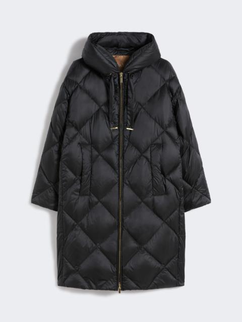 DETAILS Straight midi down jacket featuring an all-over quilted diamond pattern with horizontal stripe detail at the back hem. Down jacket in iridescent water-repellent nylon canvas Drawstring hood and low set sleeves Front fastening with double slider zip Welt pockets on the sides Goose-down padding COMPOSITION AND CARE Fabric 100% polyamide; lining 100% polyamide; with quilting virgin goose-down. Machine wash cold delicate cycle; do not bleach; do not tumble dry; line drying in the shade; cool iron; professionally dry clean perchloroethylene - mild process.; wash the garment while it is fastened.; don’t iron the labels.; protect the ends stoppers and/or the cord ends before washing.; turn the articles inside out before washing.; contains non-textile parts of animal origin. Distributed by Max Mara S.r.l., registered office in Reggio Emilia (Italy), Via Giulia Maramotti 4, 42124 (IT)