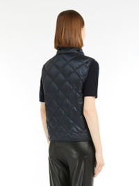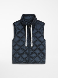 DETAILS Short gilet in water-repellent iridescent technical canvas featuring goose down padding and all-over diamond-quilted detail. The model boasts in-seam side pockets and a drawstring-adjustable high neck, complete with Max Mara-branded jacquard ribbons. Metal zip fastening on the front. The model comes with a travel-suitable Cube Bag cover. COMPOSITION AND CARE Fabric 100% polyamide; lining 100% polyamide; with quilting virgin goose-down; care case 100% polyamide. Machine wash cold delicate cycle; do not bleach; do not tumble dry; line drying in the shade; cool iron; professionally dry clean perchloroethylene - mild process.; wash the garment while it is fastened.; don’t iron the labels.; protect the ends stoppers and/or the cord ends before washing.; turn the articles inside out before washing.; contains non-textile parts of animal origin. Distributed by Max Mara S.r.l., registered office in Reggio Emilia (Italy), Via Giulia Maramotti 4, 42124 (IT)