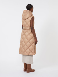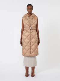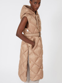 DETAILS Padded midi quilted gilet, featuring a removable belt inserted into the martingale at the back waist. Water-repellent nylon canvas gilet Drawstring hood Zip fastening with double slider Welt pockets on the sides Deep side slits with metal logo snap-buttons Goose-down padding COMPOSITION AND CARE Fabric 100% polyamide; lining 100% polyamide; with quilting virgin goose-down. Machine wash cold delicate cycle; do not bleach; do not tumble dry; line drying in the shade; cool iron; professionally dry clean perchloroethylene - mild process.; wash the garment while it is fastened.; wash the belt in a net sack.; don’t iron the labels.; protect buttons before washing.; protect the ends stoppers and/or the cord ends before washing.; turn the articles inside out before washing.; remove the buckle before washing.; contains non-textile parts of animal origin. Distributed by Max Mara S.r.l., registered office in Reggio Emilia (Italy), Via Giulia Maramotti 4, 42124 (IT)