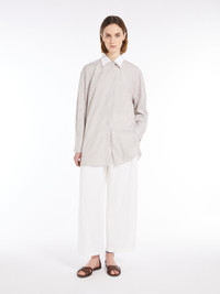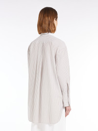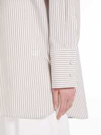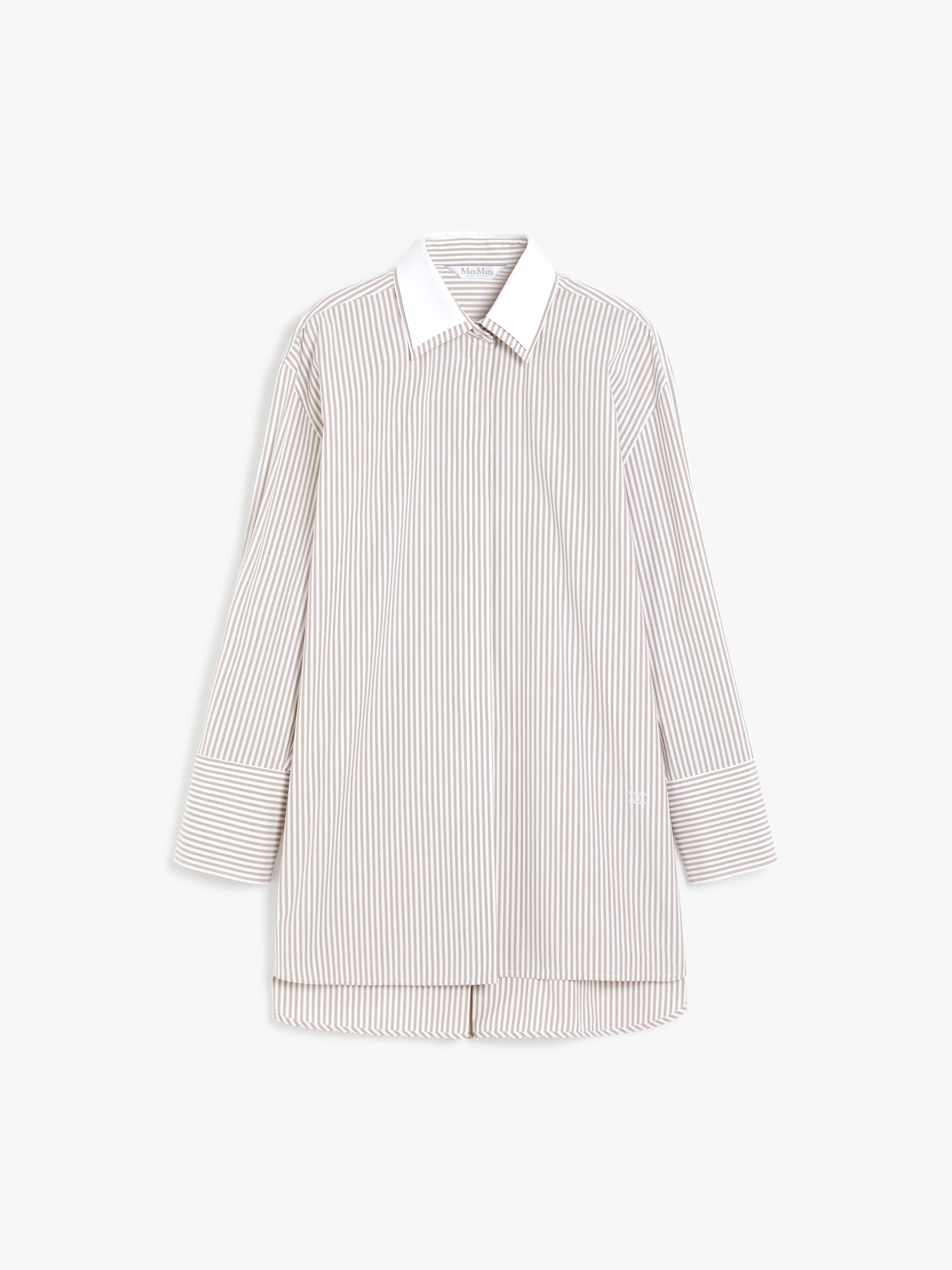 DETAILS Oversized menswear shirt made of striped pure cotton poplin. The style features a double overlapping collar in a contrasting colour, long sleeves with dropped shoulders and high cuff with a double covered button. Small rounded side slits, yoke cut at the back and central pleat at the back. Finished with a small M Monogram logo embroidered in thread at the hem, on the left side when worn. Concealed button fastening. COMPOSITION AND CARE Fabric 97% cotton, 3% elastane; - exclusive of embroideries. Machine wash cold delicate cycle; do not bleach; do not tumble dry; line drying in the shade; cool iron; professionally dry clean perchloroethylene - mild process.; wash the garment while it is fastened.; do not iron the buttons.; turn the articles inside out before washing.; contains non-textile parts of animal origin. Distributed by Max Mara S.r.l., registered office in Reggio Emilia (Italy), Via Giulia Maramotti 4, 42124 (IT)