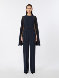 DETAILS Minimalist jumpsuit embellished with a cape motif in washed, pure silk georgette, which covers the arms and shoulders. Cady jumpsuit Menswear-style trousers with straight leg Halter neck Invisible zip fastening on the back Slant pockets at the sides and trouser crease Matching belt in patent leather with brushed metal buckle Partially lined COMPOSITION AND CARE Jumpsuit fabric 71% triacetate, 29% polyester; fabric 2 100% silk; lining 85% acetate, 10% silk, 5% polyamide; with belt in polyester with polyurethane coating. Jumpsuit: do not wash; do not bleach; do not tumble dry; cool iron; professionally dry clean perchloroethylene - mild process; do not wet clean. Belt: do not wash; do not bleach; do not tumble dry; do not iron; do not dry clean; do not wet clean. Distributed by Max Mara S.r.l., registered office in Reggio Emilia (Italy), Via Giulia Maramotti 4, 42124 (IT)