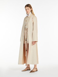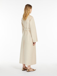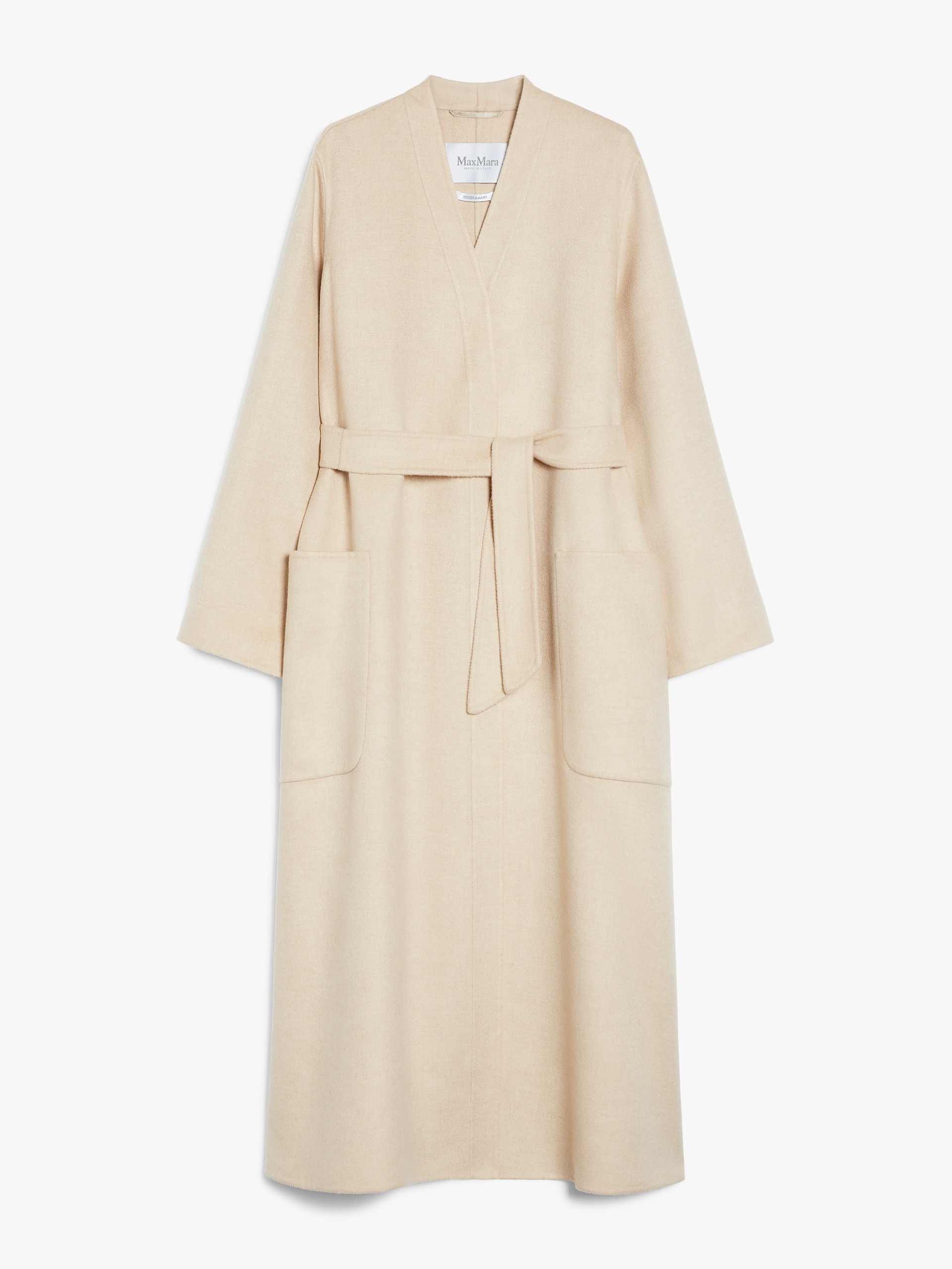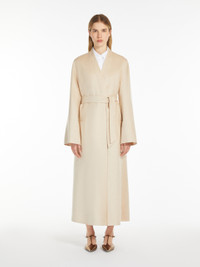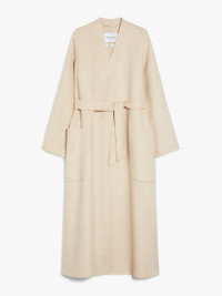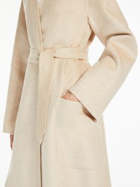 DETAILS Long wrap coat made from luxurious, hand-sewn pure ivory camel hair drap double cloth. Cardigan-inspired style, with long, set-in sleeves, patch pockets on the front and centre-back vent. The wrap closure with a matching belt helps accentuate the waist. COMPOSITION AND CARE Fabric 100% camelwool; - except joining thread. Do not wash; do not bleach; do not tumble dry; cool iron; professionally dry clean perchloroethylene - mild process; do not wet clean. Distributed by Max Mara S.r.l., registered office in Reggio Emilia (Italy), Via Giulia Maramotti 4, 42124 (IT)