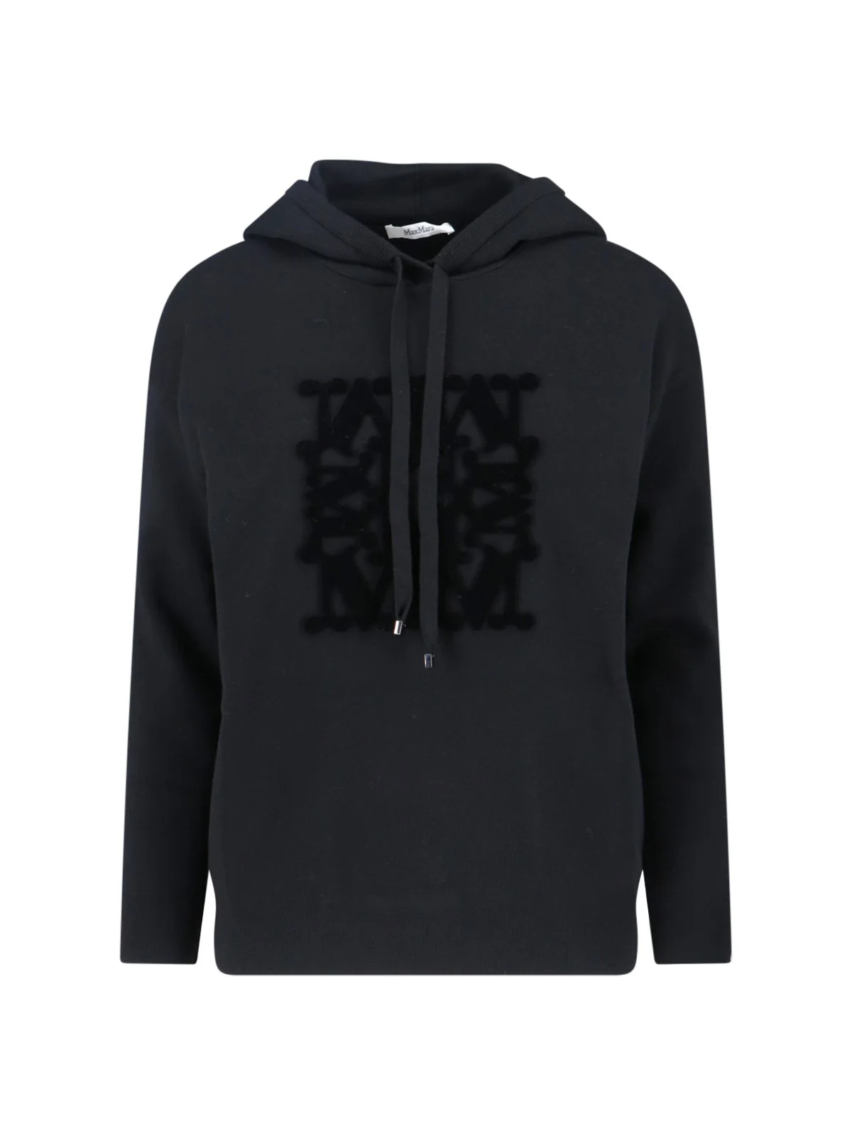 MAX MARA BLACK VIRGIN WOOL HOODIE WITH DRAWSTRING HOOD, DROPPED SHOULDERS, TONE-ON-TONE EMBOSSED LOGO ON THE FRONT, RIBBED TRIM, STRAIGHT HEM. PRODUCT INFO PRODUCT CODE 2521366222600016 COMPOSITION: 100% VIRGIN WOOL SIZE AND FIT: SOFT FIT MADE IN: CHINA