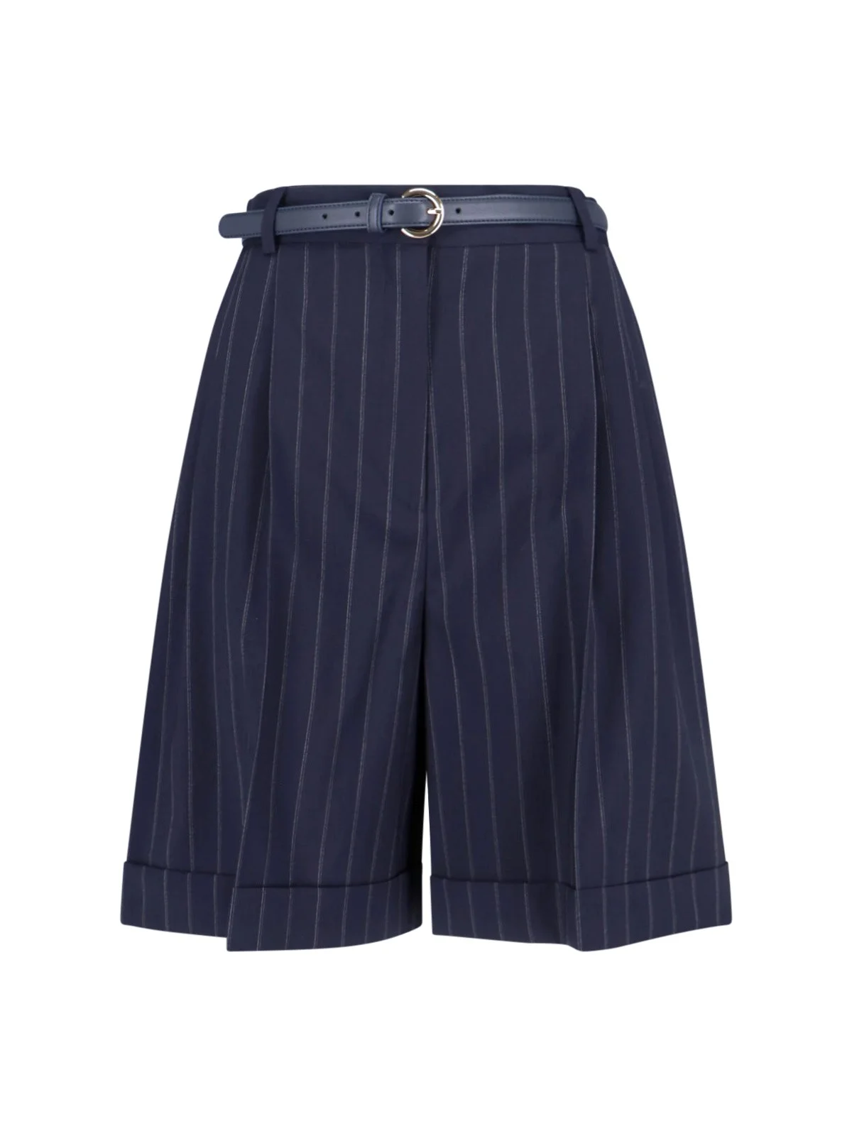 MAX MARA NAVY BLUE VIRGIN WOOL SHORTS WITH STRIPED PATTERN, ADJUSTABLE BELT DETAIL AT THE WAIST, TWO SIDE POCKETS, STRAIGHT LEG. PRODUCT INFO PRODUCT CODE 2616141011600001 COMPOSITION: 100% VIRGIN WOOL SIZE AND FIT: REGULAR FIT MADE IN: ROMANIA