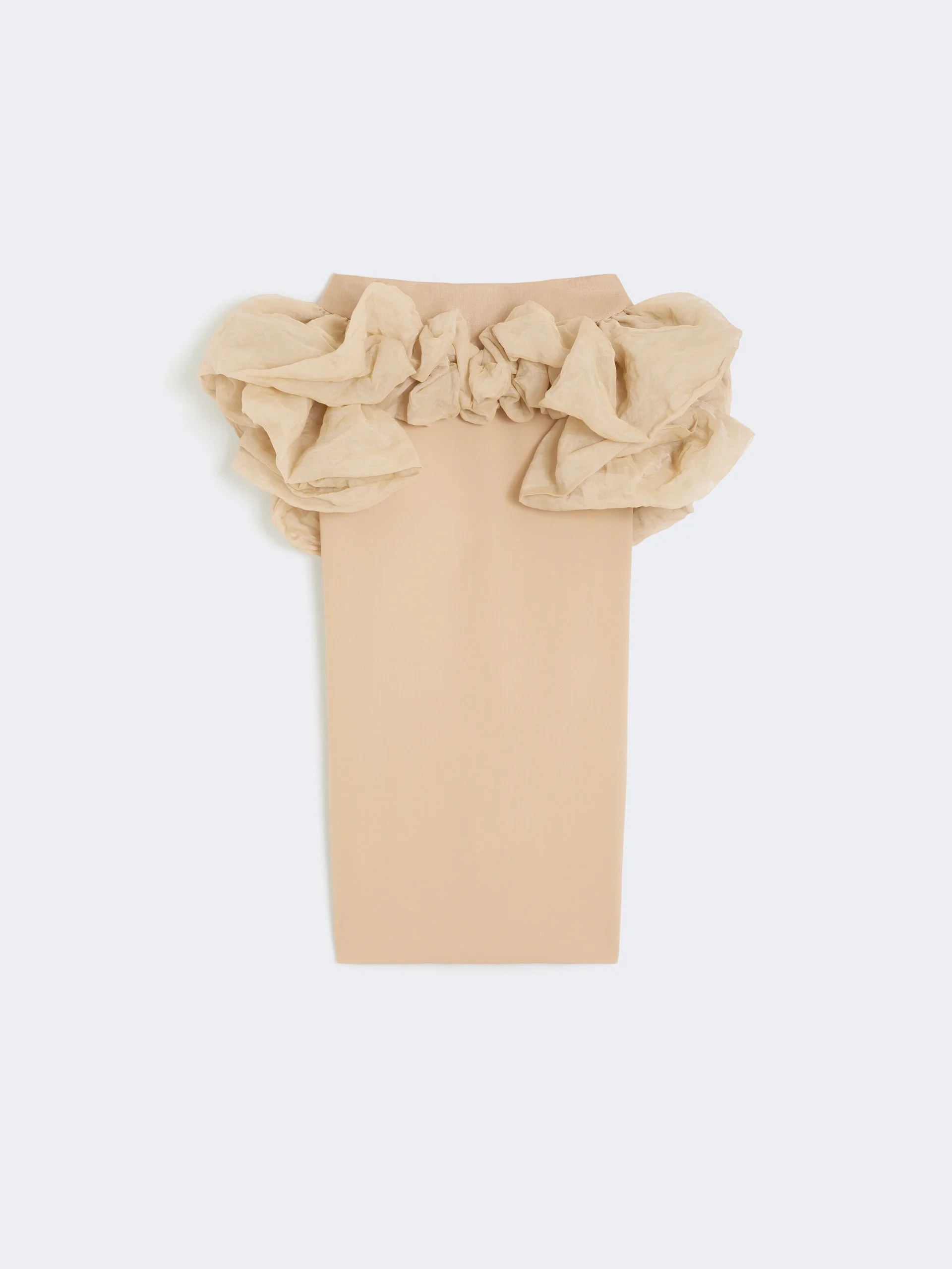 DETAILS Knit pencil skirt with silk, lurex and cotton organza ruffle motif at the waist. - Slim fit - Compact stretch viscose jersey skirt - Back concealed zip fastening - Side inset pockets - Yoke bonded in pure linen basketweave - Centre slit on the back - Lined COMPOSITION AND CARE Jersey fabric 78% viscose, 16% polyamide, 6% elastane; fabric 2 59% cotton, 31% metallic fiber, 10% silk; fabric 3 100% flaxlinen; - except joining thread; lining 95% acetate, 5% elastane. Do not wash; do not bleach; do not tumble dry; cool iron; professionally dry clean perchloroethylene - mild process; do not wet clean.; restore the curly part of the fabric using steam.; put this item into a string bag before washing it.; turn the articles inside out before washing. Distributed by Max Mara S.r.l., registered office in Reggio Emilia (Italy), Via Giulia Maramotti 4, 42124 (IT) Collection: Runway Product code: 1771056306001 - MXSBACCANO