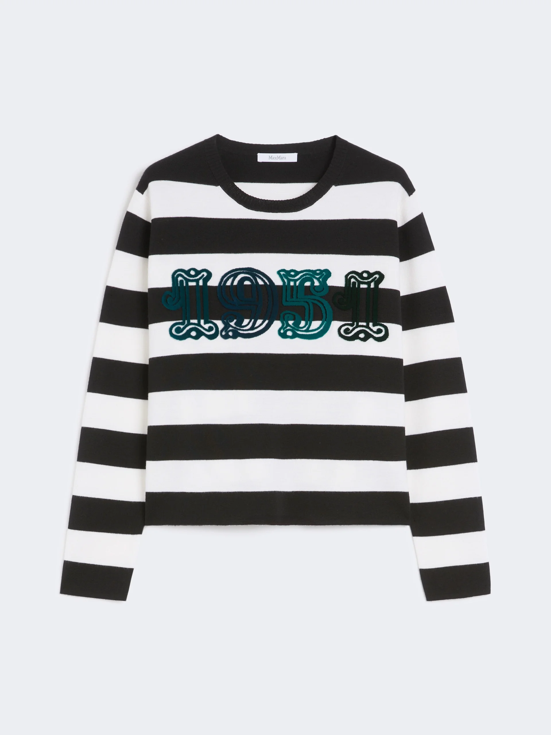 DETAILS Full Milano-knit sweater customised with flocked 1951 detail on the front. - Sweater in striped fine pure wool yarn - Boxy fit - Crew neckline - Drop-shoulder long sleeves COMPOSITION AND CARE Knitted fabric 100% virgin wool; - exclusive of decoration. Do not wash; do not bleach; do not tumble dry; cool iron; professionally dry clean perchloroethylene - mild process; do not wet clean.; iron with a cloth between.; to be ironed with no steam.; do not iron the decoration. Distributed by Max Mara S.r.l., registered office in Reggio Emilia (Italy), Via Giulia Maramotti 4, 42124 (IT)