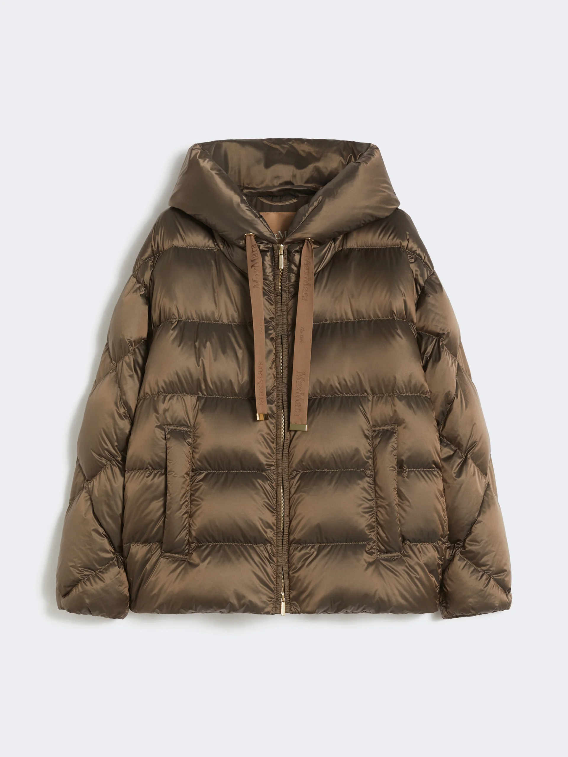 DETAILS Short down jacket with horizontal-striped quilting on the front bodice and diamond pattern on the back, hood and sleeves. - Water-repellent iridescent canvas down jacket - Straight fit - Drawstring hood with jacquard logo-branded ribbons - Two-way zip fastening on the front - Welt side pockets - Goose down padding COMPOSITION AND CARE Fabric 100% polyamide; lining 100% polyamide; with quilting virgin goose-down; - exclusive of decoration. Machine wash cold delicate cycle; do not bleach; do not tumble dry; line drying in the shade; cool iron; professionally dry clean perchloroethylene - mild process.; wash the garment while it is fastened.; don’t iron the labels.; protect the ends stoppers and/or the cord ends before washing.; turn the articles inside out before washing.; contains non-textile parts of animal origin. Distributed by Max Mara S.r.l., registered office in Reggio Emilia (Italy), Via Giulia Maramotti 4, 42124 (IT) Collection: Max Mara The Cube Product code: 9481086406044 - MTCSOFTFE