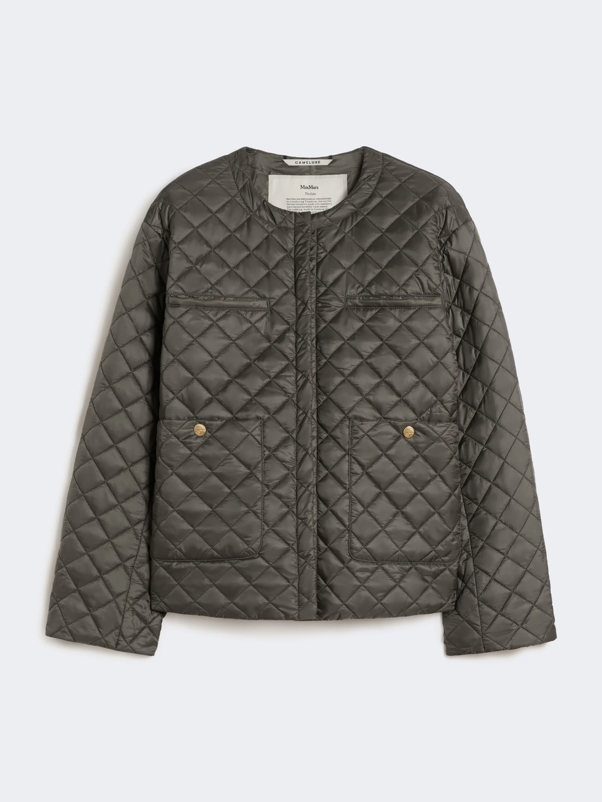 DETAILS Padded round-neck jacket with diamond-quilted pattern and totally smooth interior. - The Cameluxe padding sets the garment apart - Water-repellent canvas jacket - Drop-shoulder sleeves - Concealed press-stud fastening on the front - Horizontal-welt pockets on the chest - Patch pockets with press stud at the bottom - Rounded hem COMPOSITION AND CARE Fabric 100% polyester; with quilting in 48% camelwool, 48% polyester, 4% silk; lining 100% polyester. Do not wash; do not bleach; do not tumble dry; do not iron; professionally dry clean perchloroethylene - mild process; do not wet clean.; wash the garment while it is fastened.; turn the articles inside out before washing. Distributed by Max Mara S.r.l., registered office in Reggio Emilia (Italy), Via Giulia Maramotti 4, 42124 (IT) Collection: Max Mara The Cube Product code: 9481066406084 - MTCGIOIOSA