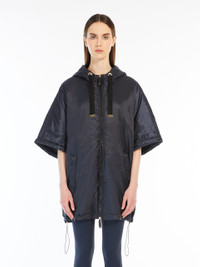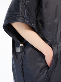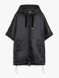 DETAILS Short padded cape in Upcycling water-repellent technical canvas with a drawstring hood and side welt pockets. Adjustable fit with drawstrings at the hem of the sleeve and the hem of the garment. Front zip closure. This style features CameLuxe padding: a new frontier for upcycling processes that involves recovering leftover pure camel cut-offs from the production of our legendary coats. The fibres are reused to create a special padding capable of maintaining the same thermal insulation properties as virgin materials. COMPOSITION AND CARE Fabric 100% polyester; lining 100% polyester; with quilting in 48% polyester, 48% camelwool, 4% silk; - exclusive of decoration. Do not wash; do not bleach; do not tumble dry; do not iron; professionally dry clean hydrocarbons low moisture - mild process; do not wet clean.; wash the garment while it is fastened.; don’t iron the labels.; do not apply the iron soleplate on the garment fabric.; do not iron the ribbons.; protect the ends stoppers and/or the cord ends before washing.; turn the articles inside out before washing.; take off the zip tongue before washing.; contains non-textile parts of animal origin. Distributed by Max Mara S.r.l., registered office in Reggio Emilia (Italy), Via Giulia Maramotti 4, 42124 (IT)