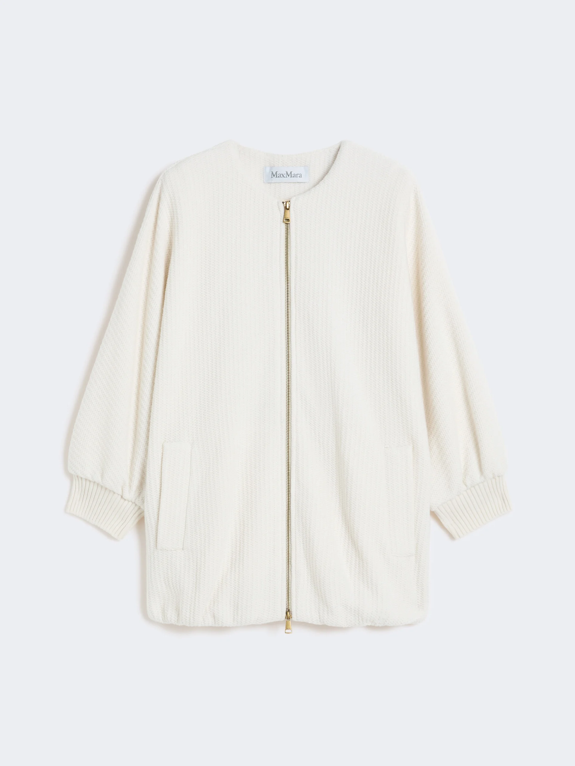 DETAILS Crew neck jacket with loose volume and wide kimono sleeves. Wool and cashmere knit jacket Front fastening with double slider zip Welt pockets on the sides Stretch rib-knit cuffs Gathered hem Leather logo plate on the back of the neck Lined COMPOSITION AND CARE Jersey fabric 93% virgin wool, 7% cashmere; lining 59% viscose, 38% cotton, 3% elastane. Do not wash; do not bleach; do not tumble dry; cool iron; professionally dry clean perchloroethylene - mild process; do not wet clean.; iron with a cloth between.; put this item into a string bag before washing it. Distributed by Max Mara S.r.l., registered office in Reggio Emilia (Italy), Via Giulia Maramotti 4, 42124 (IT)