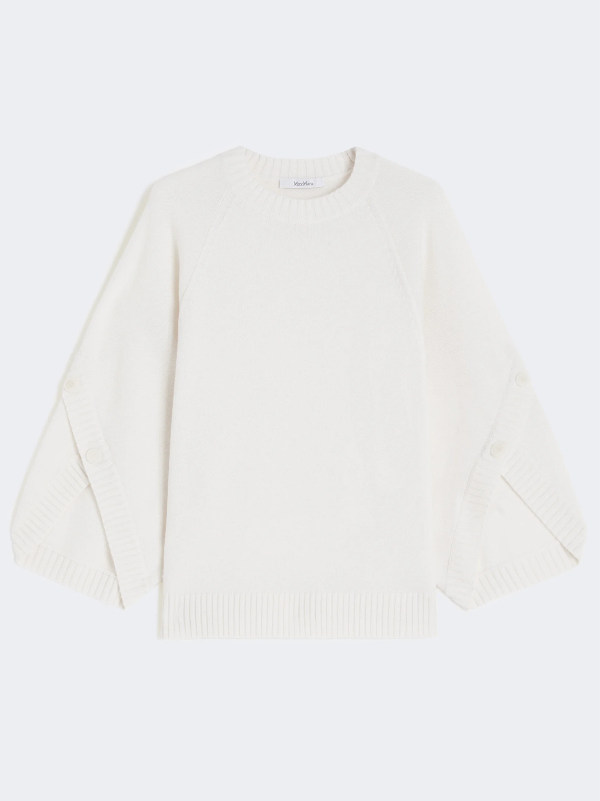DETAILS Slightly oversized sweater featuring crossover detail and branded horn buttons on the sleeves. Stockinette-stitched wool and cashmere yarn sweater Crew neckline Loose-fitting raglan sleeves Branded horn plate on the back of the neck Ribbed hems COMPOSITION AND CARE 70% wool, 30% cashmere. Hand wash cold (40°c max); do not bleach; do not tumble dry; flat drying in the shade; cool iron; professionally dry clean perchloroethylene - mild process; do not wet clean.; iron with a cloth between.; using neutral detergent. Distributed by Max Mara S.r.l., registered office in Reggio Emilia (Italy), Via Giulia Maramotti 4, 42124 (IT)