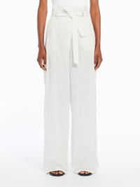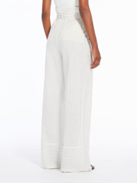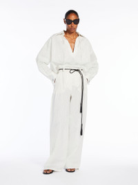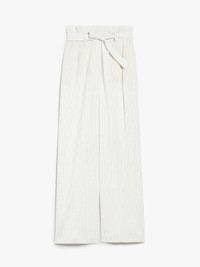 DETAILS Palazzo trousers in lightweight cotton canvas and pinstriped silk, featuring wide legs, pleats on the front, slant pockets at the side and back welt pockets. Finished with a horizontal striped printed detail at the back of the hem. The matching belt accentuates the silhouette. Concealed zip and button fastening. COMPOSITION AND CARE 80% cotton, 20% silk. Do not wash; do not bleach; do not tumble dry; cool iron; professionally dry clean perchloroethylene - mild process; do not wet clean. Distributed by Max Mara S.r.l., registered office in Reggio Emilia (Italy), Via Giulia Maramotti 4, 42124 (IT)