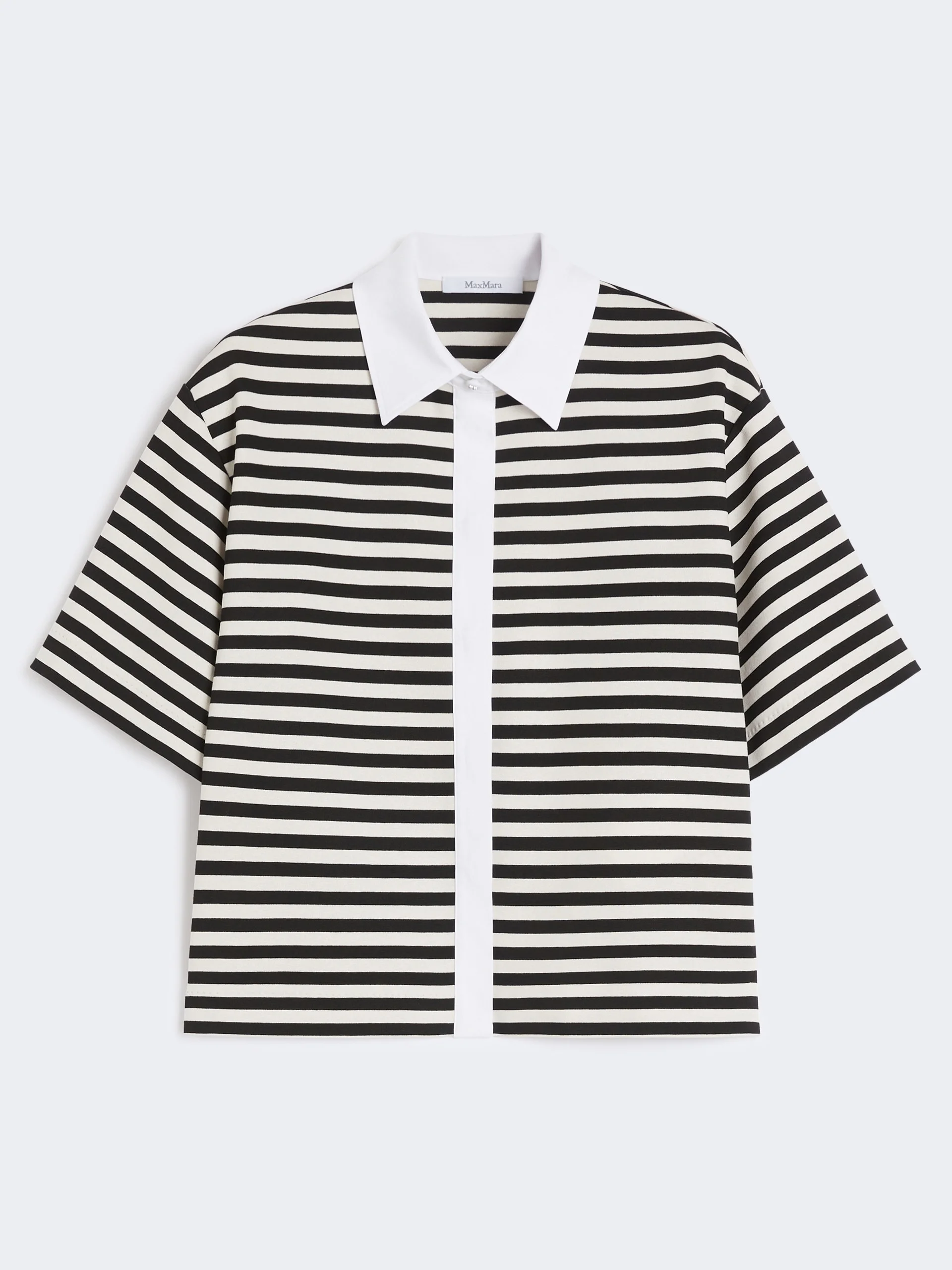 DETAILS Boxy-fit shirt with a slightly cropped waist cut. - Striped viscose jersey shirt - Shirt collar - Drop-shoulder short sleeves - Concealed front fastening - Contrasting cotton poplin details - Small squared-off side slits COMPOSITION AND CARE Jersey fabric 83% viscose, 12% polyamide, 5% elastane; fabric 97% cotton, 3% elastane. Do not wash; do not bleach; do not tumble dry; cool iron; professionally dry clean perchloroethylene - mild process; do not wet clean.; iron with a cloth between. Distributed by Max Mara S.r.l., registered office in Reggio Emilia (Italy), Via Giulia Maramotti 4, 42124 (IT)