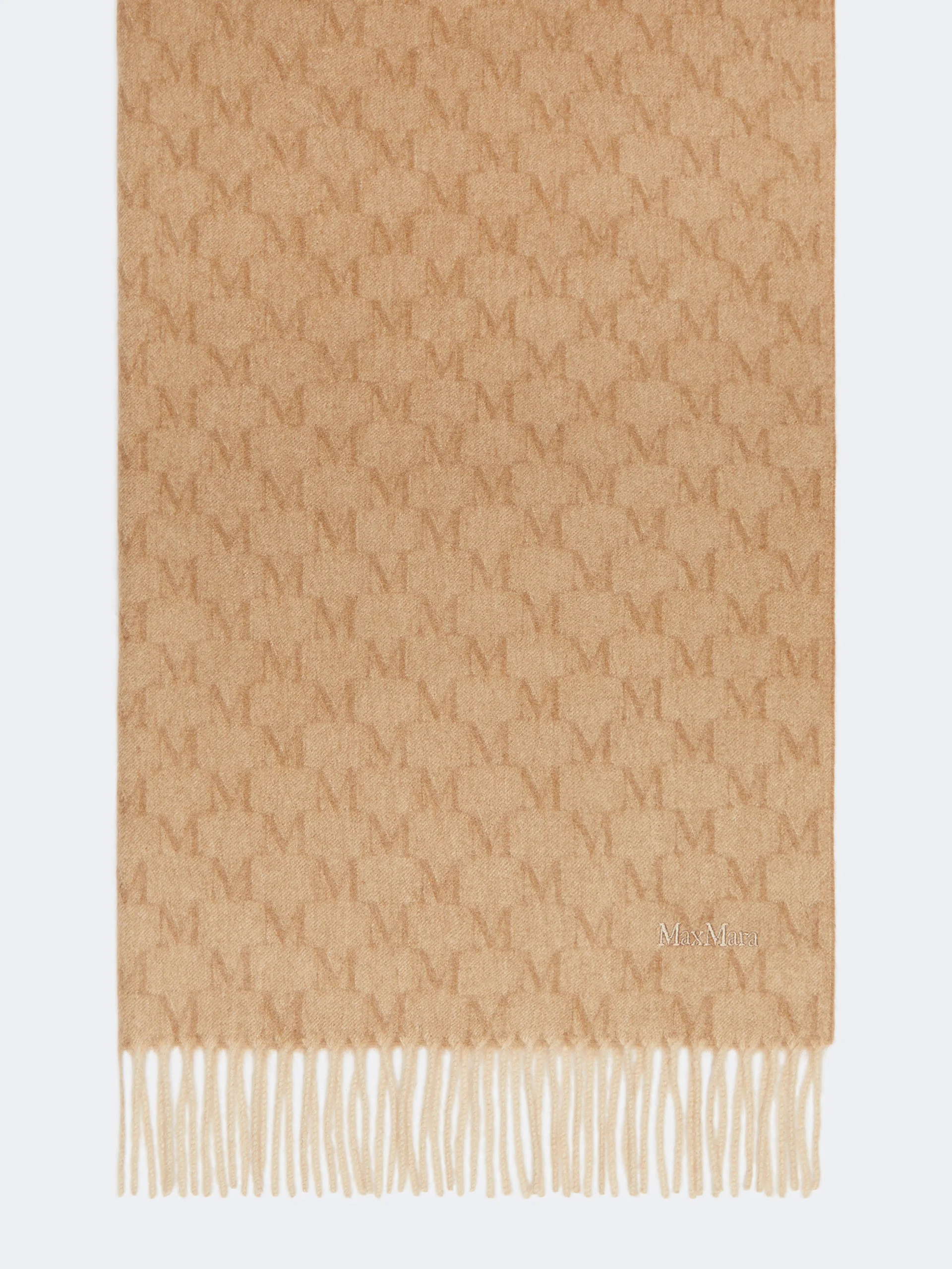DETAILS Stole featuring a jacquard-knit pattern that creates the all-over iconic M Monogram detail. Pure camel stole Embroidered Max Mara lettering at the hem Fringed detail at the end Size: 70 x 190 cm COMPOSITION AND CARE 100% camelwool. Do not wash; do not bleach; do not tumble dry; cool iron; professionally dry clean perchloroethylene - mild process; do not wet clean.; to be ironed on reverse.; to be ironed with no steam.; iron with a cloth between. Distributed by Max Mara S.r.l., registered office in Reggio Emilia (Italy), Via Giulia Maramotti 4, 42124 (IT)