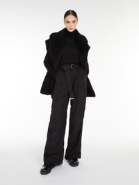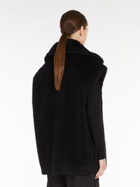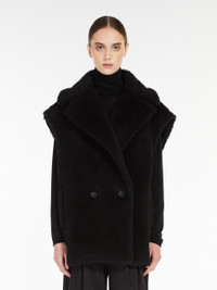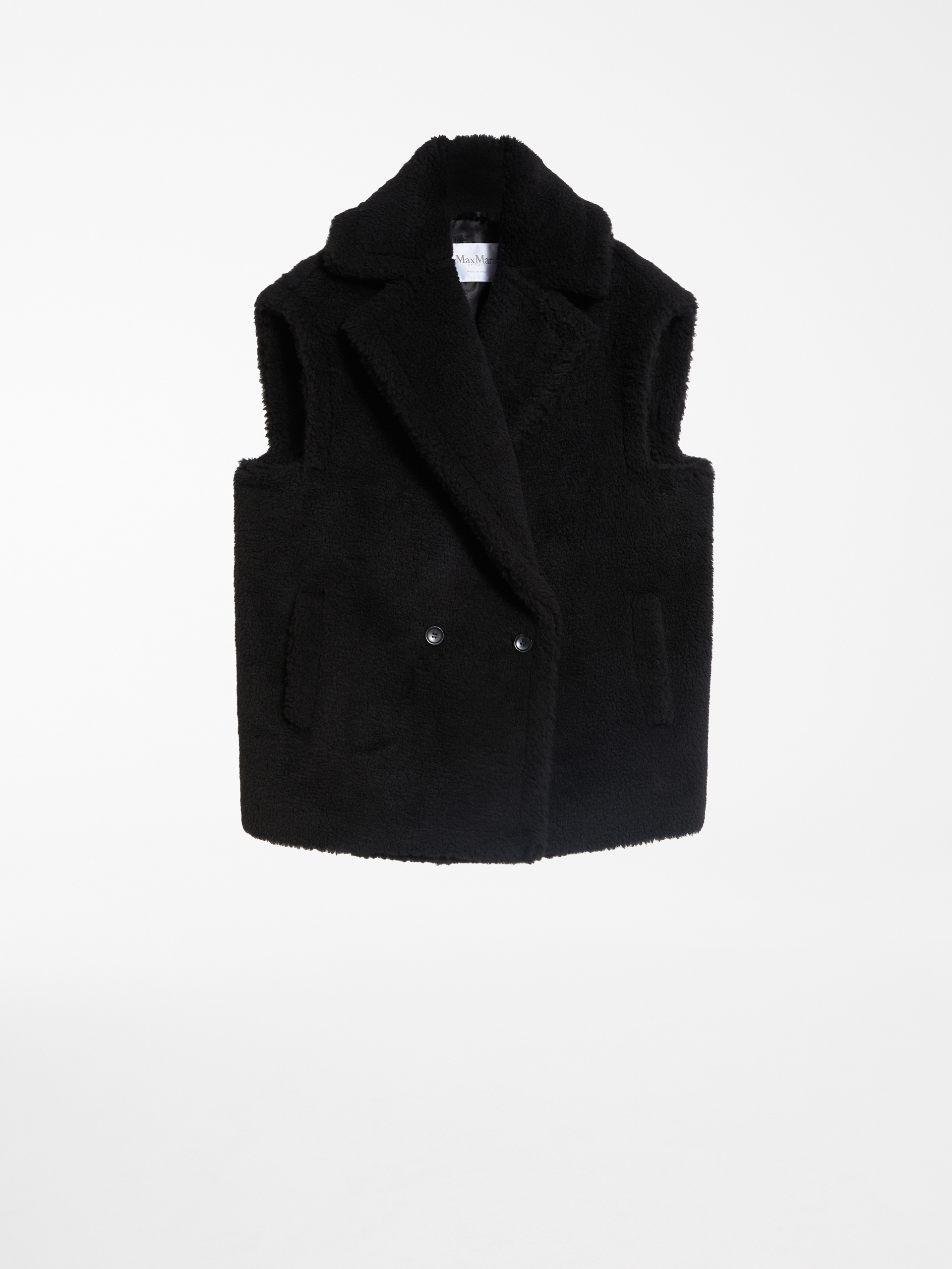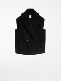 DETAILS Oversized gilet in alpaca and wool Teddy fabric, with wide lapel collar and welt pockets. Lined with monogram fabric. Double-breasted fastening with buttons. Length: 75 cm. COMPOSITION AND CARE Jersey fabric 62% alpaca, 26% virgin wool, 12% silk; lining 100% viscose. Do not wash; do not bleach; do not tumble dry; do not iron; professionally dry clean perchloroethylene - mild process; do not wet clean.; do not iron the buttons.; protect buttons before washing.; contains non-textile parts of animal origin. Distributed by Max Mara S.r.l., registered office in Reggio Emilia (Italy), Via Giulia Maramotti 4, 42124 (IT)