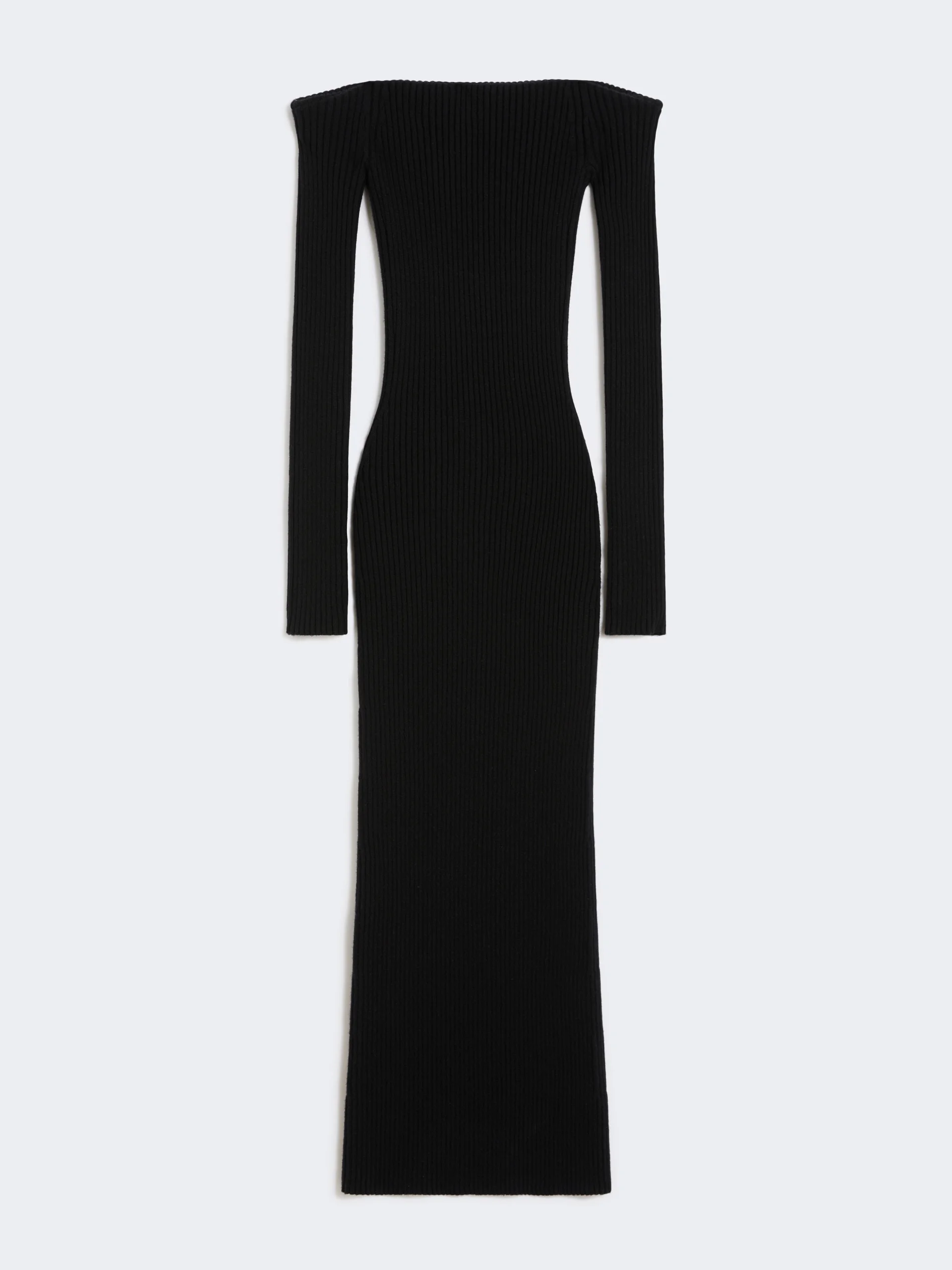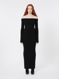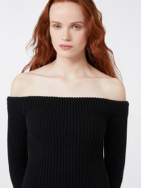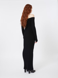 DETAILS Long, off-the-shoulder dress, featuring a ribbed design that accentuates the silhouette. Stretch wool and cashmere yarn dress Figure-hugging Straight neckline with bare shoulders Long sleeves Unlined COMPOSITION AND CARE 66% wool, 28% cashmere, 5% polyamide, 1% elastane. Hand wash cold (40°c max); do not bleach; do not tumble dry; flat drying in the shade; cool iron; professionally dry clean perchloroethylene - mild process; do not wet clean.; iron with a cloth between.; using neutral detergent. Distributed by Max Mara S.r.l., registered office in Reggio Emilia (Italy), Via Giulia Maramotti 4, 42124 (IT)