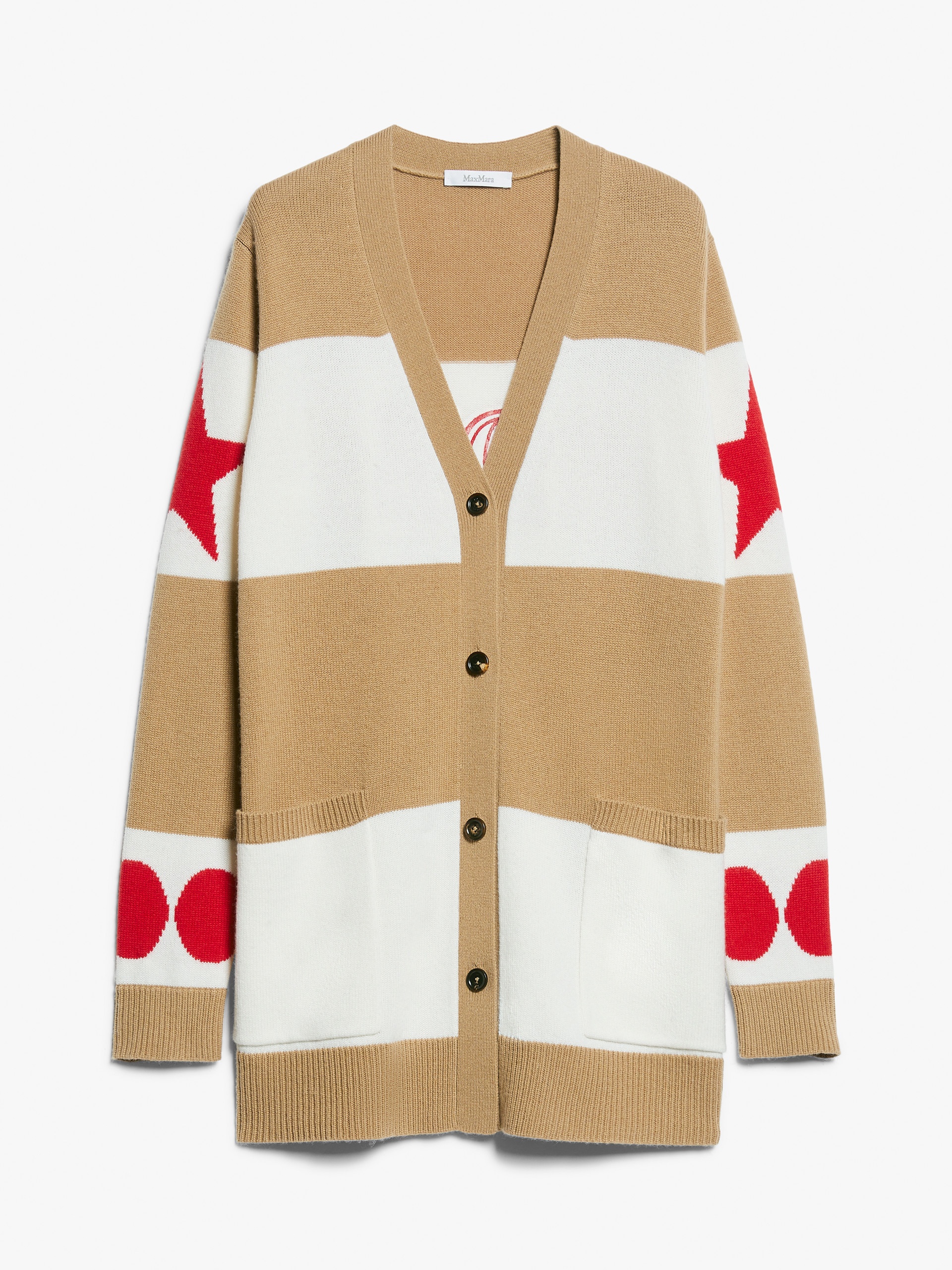 DETAILS Long cardigan with oversized volume, made of a luxurious blend of wool and cashmere in plain knit. The garment is customised with jacquard stripes, placed designs and contrasting 1951 detail, with characteristic flocked texture, applied on the back. Complete with patch pockets on the front, V-neck and ribbed edges. Front fastening with visible buttons. COMPOSITION AND CARE Knitted fabric 70% wool, 30% cashmere; - exclusive of decoration. Do not wash; do not bleach; do not tumble dry; cool iron; professionally dry clean perchloroethylene - mild process; do not wet clean.; iron with a cloth between.; to be ironed with no steam.; do not iron the decoration. Distributed by Max Mara S.r.l., registered office in Reggio Emilia (Italy), Via Giulia Maramotti 4, 42124 (IT)