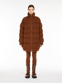 DETAILS Short down jacket with an oversized volume in soft wool and cashmere yarn, embellished with a large cable knit and all-over horizontal quilted motif. Finished with a rib-knit high neck, cuffs and hem. The style is padded with an exclusive material, obtained from the upcycling of iconic camel Teddy fabric. Front double-slider zip fastening. Length: 90 cm COMPOSITION AND CARE Jersey fabric 90% wool, 10% cashmere; lining 1 90% wool, 10% cashmere; lining 2 95% acetate, 5% elastane; fibre padding 70% polyester, 27% camelwool, 3% silk. Do not wash; do not bleach; do not tumble dry; cool iron; professionally dry clean perchloroethylene - mild process; do not wet clean.; iron with a cloth between. Distributed by Max Mara S.r.l., registered office in Reggio Emilia (Italy), Via Giulia Maramotti 4, 42124 (IT)