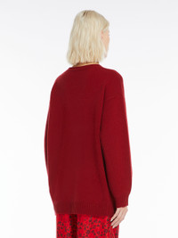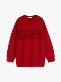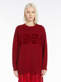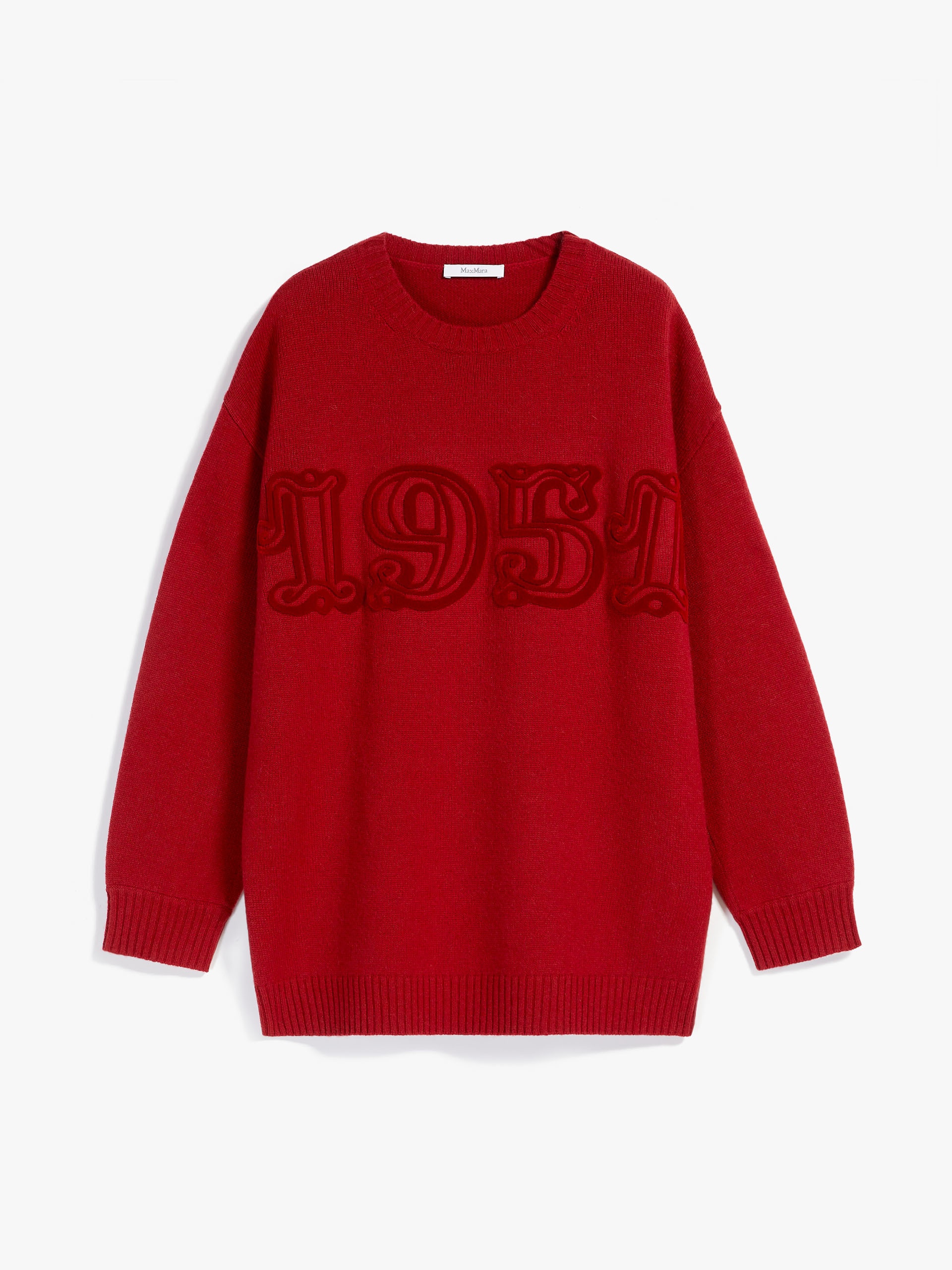 DETAILS Oversize jumper in stockinette-stitch cashmere and wool yarn, with dropped set-in sleeves. The garment is branded with the 1951 appliqué (the year the brand was founded), made of velvet with the Maxmaragram font. Embellished with a collar, cuffs and ribbed hem. Length: 72 cm. COMPOSITION AND CARE Knitted fabric 70% wool, 30% cashmere; - exclusive of decoration. Do not wash; do not bleach; do not tumble dry; cool iron; professionally dry clean perchloroethylene - mild process; do not wet clean.; iron with a cloth between.; to be ironed with no steam.; do not iron the decoration. Distributed by Max Mara S.r.l., registered office in Reggio Emilia (Italy), Via Giulia Maramotti 4, 42124 (IT)
