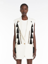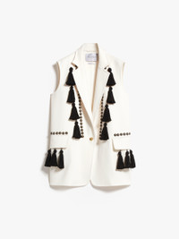 DETAILS Midi gilet in exquisite wool and double cashmere fabric, featuring an unlined sartorial construction with a wide lapel collar, flap pockets on the front and side vents at the back. The style is embellished with hand-embroidered symmetrical studs and tassels on the front with a graphic effect. Single button fastening at the front COMPOSITION AND CARE Fabric 90% virgin wool, 10% cashmere; - except joining thread; decorations 50% cotton, 50% acetate. Do not wash; do not bleach; do not tumble dry; cool iron; professionally dry clean perchloroethylene - mild process; do not wet clean.; wash the garment while it is fastened.; do not iron the buttons.; protect buttons before washing.; turn the articles inside out before washing.; remove the tassels before washing.; contains non-textile parts of animal origin. Distributed by Max Mara S.r.l., registered office in Reggio Emilia (Italy), Via Giulia Maramotti 4, 42124 (IT)
