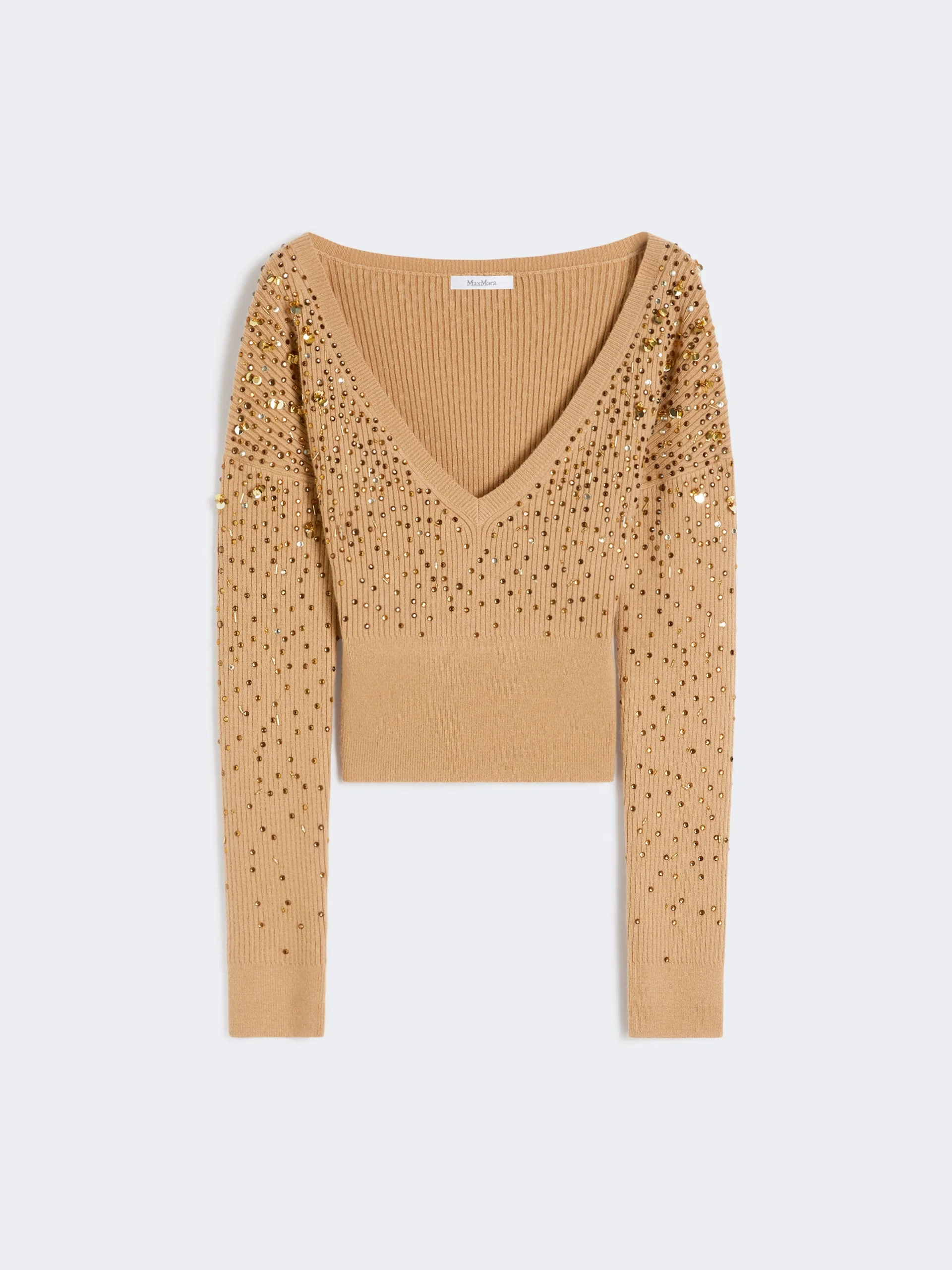 DETAILS Feminine sweater featuring hand-embroidered wet-look sequin detail. - Rib-knit wool and cashmere yarn sweater - Slim, cropped cut - Wide V-neckline - Long low set-in sleeves - Straight hem COMPOSITION AND CARE Knitted fabric 62% wool, 27% cashmere, 10% polyamide, 1% elastane; - exclusive of decoration. Hand wash cold (40°c max); do not bleach; do not tumble dry; flat drying in the shade; cool iron; do not dry clean; do not wet clean.; iron with a cloth between.; do not leave to soak.; using neutral detergent.; don’t rub.; squeeze without wringing.; to be ironed on reverse. Distributed by Max Mara S.r.l., registered office in Reggio Emilia (Italy), Via Giulia Maramotti 4, 42124 (IT) Collection: Max Mara Product code: 1361056106027 - MXMGANG