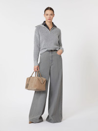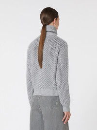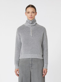 DETAILS Mesh-knit cropped sweater. - Sweater in lurex thread-adorned wool and cashmere yarn - Relaxed fit - High polo-style collar with metal zip and leather slider - Long low set-in sleeves - Ribbed edges - Straight hem COMPOSITION AND CARE 66% wool, 29% cashmere, 3% polyester, 2% metallised fiber. Hand wash cold (40°c max); do not bleach; do not tumble dry; flat drying in the shade; cool iron; professionally dry clean perchloroethylene - mild process; do not wet clean.; iron with a cloth between.; using neutral detergent.; turn the articles inside out before washing. Distributed by Max Mara S.r.l., registered office in Reggio Emilia (Italy), Via Giulia Maramotti 4, 42124 (IT) Collection: Max Mara Product code: 1361036106003 - MXMTEQUILA