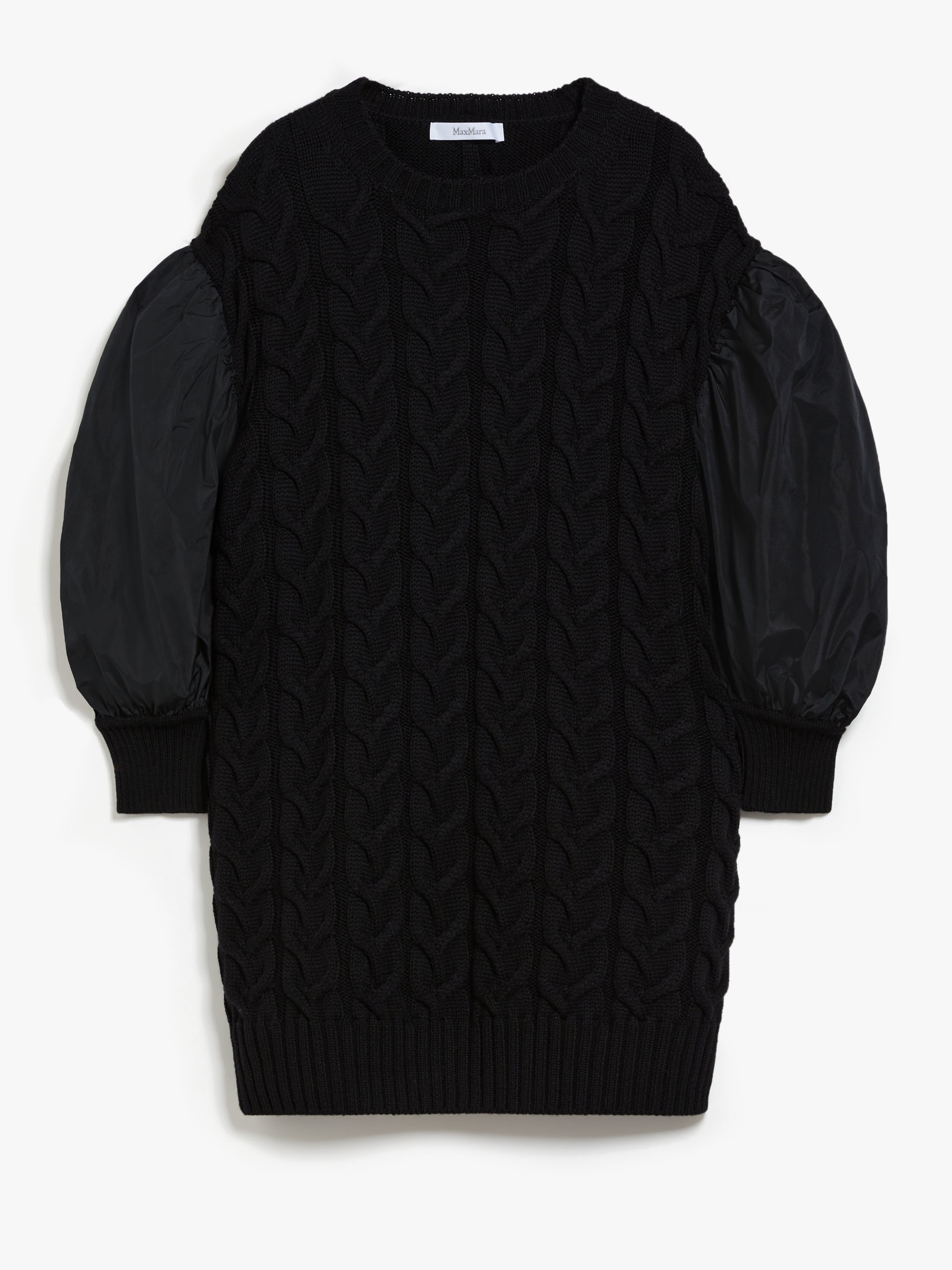 DETAILS Short dress with slightly oversized volume, made of luxurious pure wool yarn in a cable knit. The long sleeves feature balloon inserts in matching taffeta on the upper section. Feminine and refined, it is finished with a crew neckline, ribbed cuffs and he COMPOSITION AND CARE Knitted fabric 100% virgin wool; fabric 75% polyester, 25% silk. Do not wash; do not bleach; do not tumble dry; cool iron; professionally dry clean perchloroethylene - mild process; do not wet clean.; iron with a cloth between. Distributed by Max Mara S.r.l., registered office in Reggio Emilia (Italy), Via Giulia Maramotti 4, 42124 (IT)