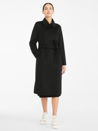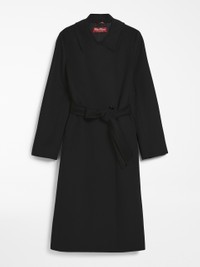 DETAILS Long, double-breasted robe-inspired coat made of exquisite pure wool fabric with long sleeves, side pockets and concealed buttons with matching belt at the waist. The design features a double-function pointed collar to be worn open with lapels or fastened with a button. Lined. Length: 110 cm COMPOSITION AND CARE Fabric 100% virgin wool; lining 100% viscose. Do not wash; do not bleach; do not tumble dry; cool iron; professionally dry clean perchloroethylene - mild process; do not wet clean.; do not iron the buttons.; protect buttons before washing.; contains non-textile parts of animal origin. Distributed by Max Mara S.r.l., registered office in Reggio Emilia (Italy), Via Giulia Maramotti 4, 42124 (IT)