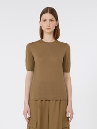 DETAILS Slim-fit essential-style sweater. Stockinette-stitched sweater in fine pure wool yarn Slim fit Crew neckline Short set-in sleeves COMPOSITION AND CARE 100% virgin wool. Hand wash cold (40°c max); do not bleach; do not tumble dry; flat drying in the shade; cool iron; professionally dry clean perchloroethylene - mild process; do not wet clean.; iron with a cloth between.; using neutral detergent. Distributed by Max Mara S.r.l., registered office in Reggio Emilia (Italy), Via Giulia Maramotti 4, 42124 (IT)