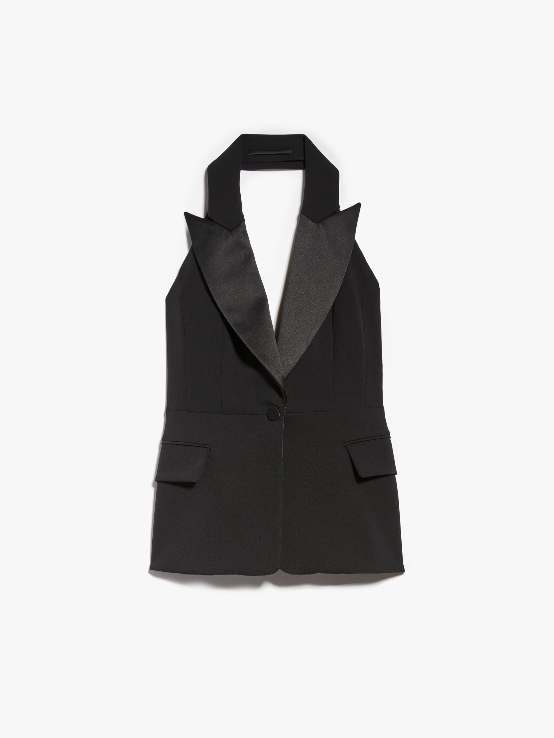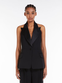 DETAILS Tuxedo-inspired waistcoat made of luxurious stretch wool. The tailored construction features a halter neck with peak lapels, a cut-out detail at the back and front welt pockets with a flap. The silhouette is defined by its seam motif at the waist with reverse pleats at the back and two covered buttons. Finished with shiny satin details in the same shades. Length: 65 cm. COMPOSITION AND CARE Fabric 98% virgin wool, 2% elastane; fabric 2 100% polyester; lining 70% acetate, 30% cupro. Do not wash; do not bleach; do not tumble dry; cool iron; professionally dry clean perchloroethylene - mild process; do not wet clean. Distributed by Max Mara S.r.l., registered office in Reggio Emilia (Italy), Via Giulia Maramotti 4, 42124 (IT)