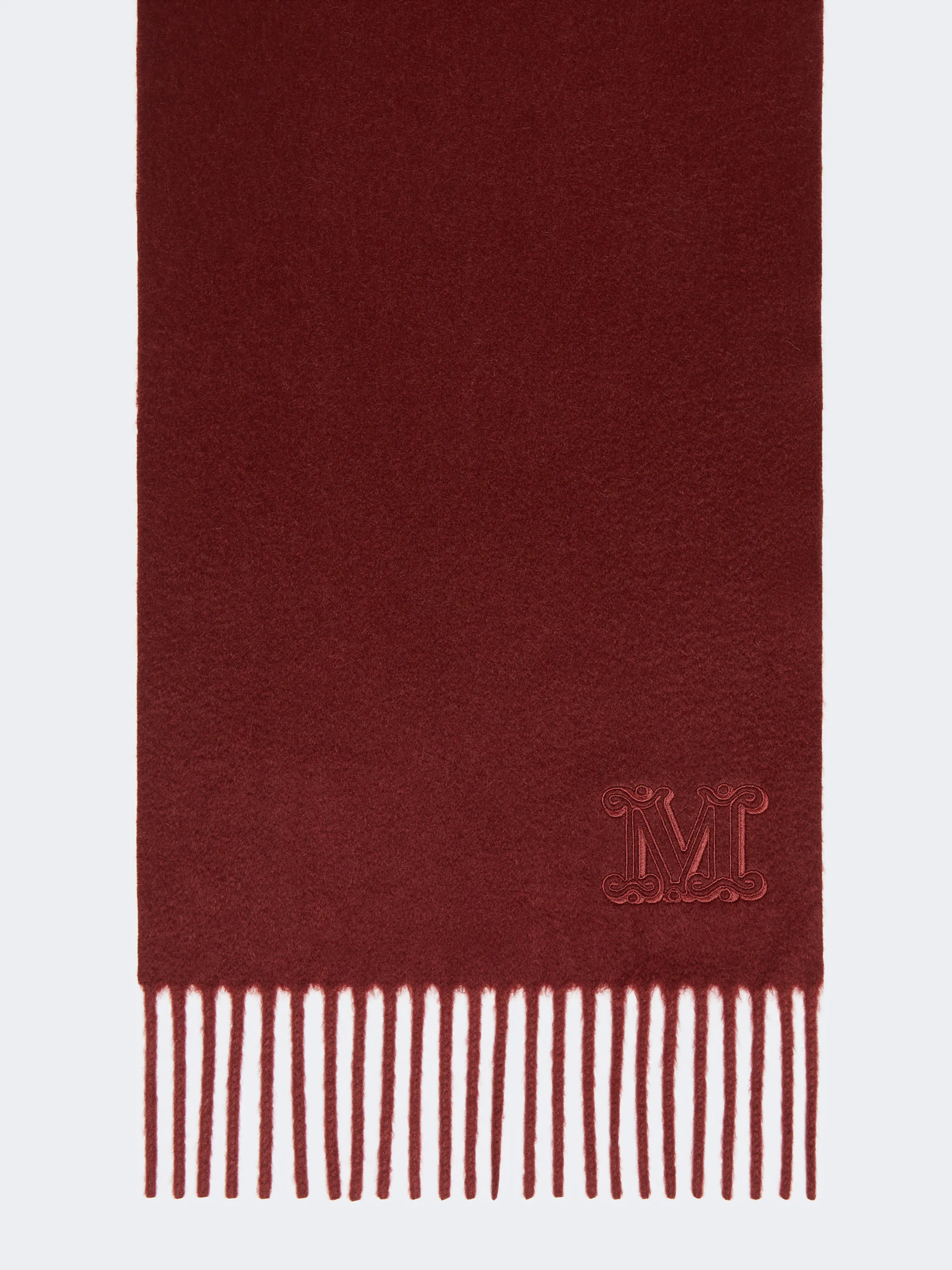 DETAILS Stole with minimalist design, embellished with elegant, tonal embroidered M Monogram detail at the bottom. Stole in sable-look pure cashmere yarn Fringed shorter sides Size: 28 x 206 cm COMPOSITION AND CARE 100% cashmere. Do not wash; do not bleach; do not tumble dry; cool iron; professionally dry clean perchloroethylene - mild process; do not wet clean.; to be ironed on reverse.; to be ironed with no steam.; iron with a cloth between. Distributed by Max Mara S.r.l., registered office in Reggio Emilia (Italy), Via Giulia Maramotti 4, 42124 (IT)