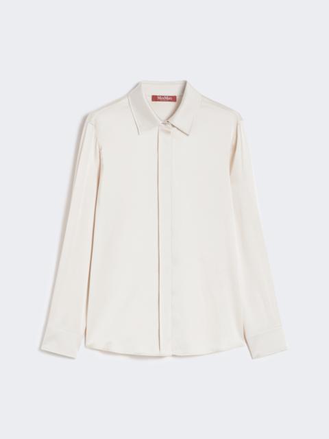 DETAILS Menswear-inspired women's shirt in silk satin, tailored to a classic silhouette defined by clean and minimal lines. Technical detailing and jewel buttons flawlessly complement the garment. Women's shirt in pure silk satin fabric Straight and fluid fit Classic pointed collar Long set-in sleeves Concealed front fastening with jewel buttons Long cuffs with double-button closure COMPOSITION AND CARE 93% silk, 7% elastane. Hand wash cold (40°c max); do not bleach; do not tumble dry; line drying in the shade; cool iron; professionally dry clean perchloroethylene - mild process; do not wet clean.; wash the garment while it is fastened.; turn the articles inside out before washing.; iron with a cloth between.; contains non-textile parts of animal origin. Distributed by Max Mara S.r.l., registered office in Reggio Emilia (Italy), Via Giulia Maramotti 4, 42124 (IT)