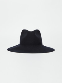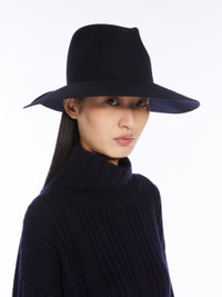 DETAILS Wide-brimmed hat made of exquisite pure wool felt. The style features a pleated pattern on the back with an oversized leather label, with Max Mara lettering and metal studs. Interior trimmed with grosgrain ribbon. COMPOSITION AND CARE Felt 100% wool; swearband 64% cotton, 36% polyester. Do not wash; do not bleach; do not tumble dry; do not iron; do not dry clean; do not wet clean.; contains non-textile parts of animal origin. Distributed by Max Mara S.r.l., registered office in Reggio Emilia (Italy), Via Giulia Maramotti 4, 42124 (IT)