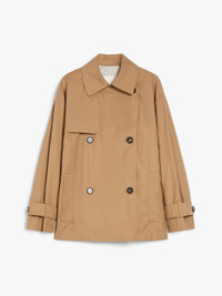DETAILS Short, double-breasted trench coat made of water-repellent technical-cotton twill, featuring a shirt collar, a storm shield on the back, long sleeves with dropped shoulders and adjustable cuff straps. Finished with an asymmetrical front storm flap on the right side as worn, welt pockets at the sides, and a central vent at the back. Semi-lined in taffeta with jacquard logo ribbon details, embellished with a tailoring-inspired pick stitch. Front fastening with horn buttons. The main fabric contains at least 50% cotton fibre grown according to organic farming standards. COMPOSITION AND CARE Fabric 66% cotton, 34% polyester; lining 100% polyester. Machine wash cold delicate cycle; do not bleach; do not tumble dry; line drying in the shade; cool iron; professionally dry clean perchloroethylene - mild process.; wash the garment while it is fastened.; don’t iron the labels.; do not iron the buttons.; protect buttons before washing.; turn the articles inside out before washing.; contains non-textile parts of animal origin. Distributed by Max Mara S.r.l., registered office in Reggio Emilia (Italy), Via Giulia Maramotti 4, 42124 (IT)