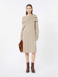 DETAILS Short off-shoulder dress with a ribbed high neck, to be worn turned down on the shoulders. Wool and cashmere knit dress Straight cut All-over cable knit Long sleeves Ribbed edges COMPOSITION AND CARE 80% wool, 20% cashmere. Hand wash cold (40°c max); do not bleach; do not tumble dry; flat drying in the shade; cool iron; professionally dry clean perchloroethylene - mild process; do not wet clean.; iron with a cloth between.; using neutral detergent. Distributed by Max Mara S.r.l., registered office in Reggio Emilia (Italy), Via Giulia Maramotti 4, 42124 (IT)