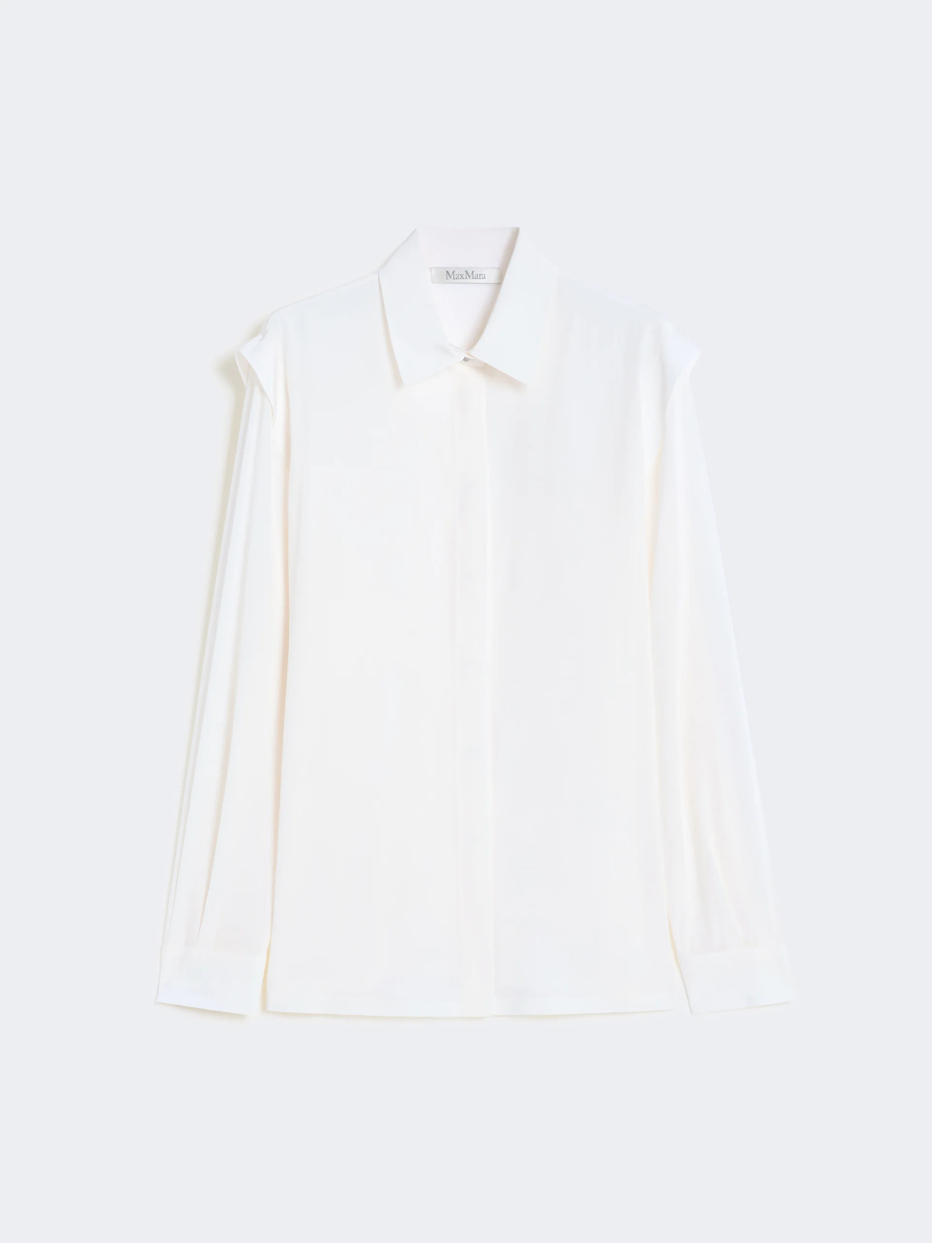 DETAILS Mannish-style shirt featuring button-up sleeves and subtle voluminous shoulders. Pure silk crepe de chine shirt Straight fit Pointed collar Concealed button fastening on the front Button on the side of the double cuffs Straight hem with squared-off side slits COMPOSITION AND CARE 100% silk. Do not wash; do not bleach; do not tumble dry; cool iron; professionally dry clean perchloroethylene - mild process; do not wet clean.; wash the garment while it is fastened.; do not iron the buttons.; protect buttons before washing.; turn the articles inside out before washing. Distributed by Max Mara S.r.l., registered office in Reggio Emilia (Italy), Via Giulia Maramotti 4, 42124 (IT)