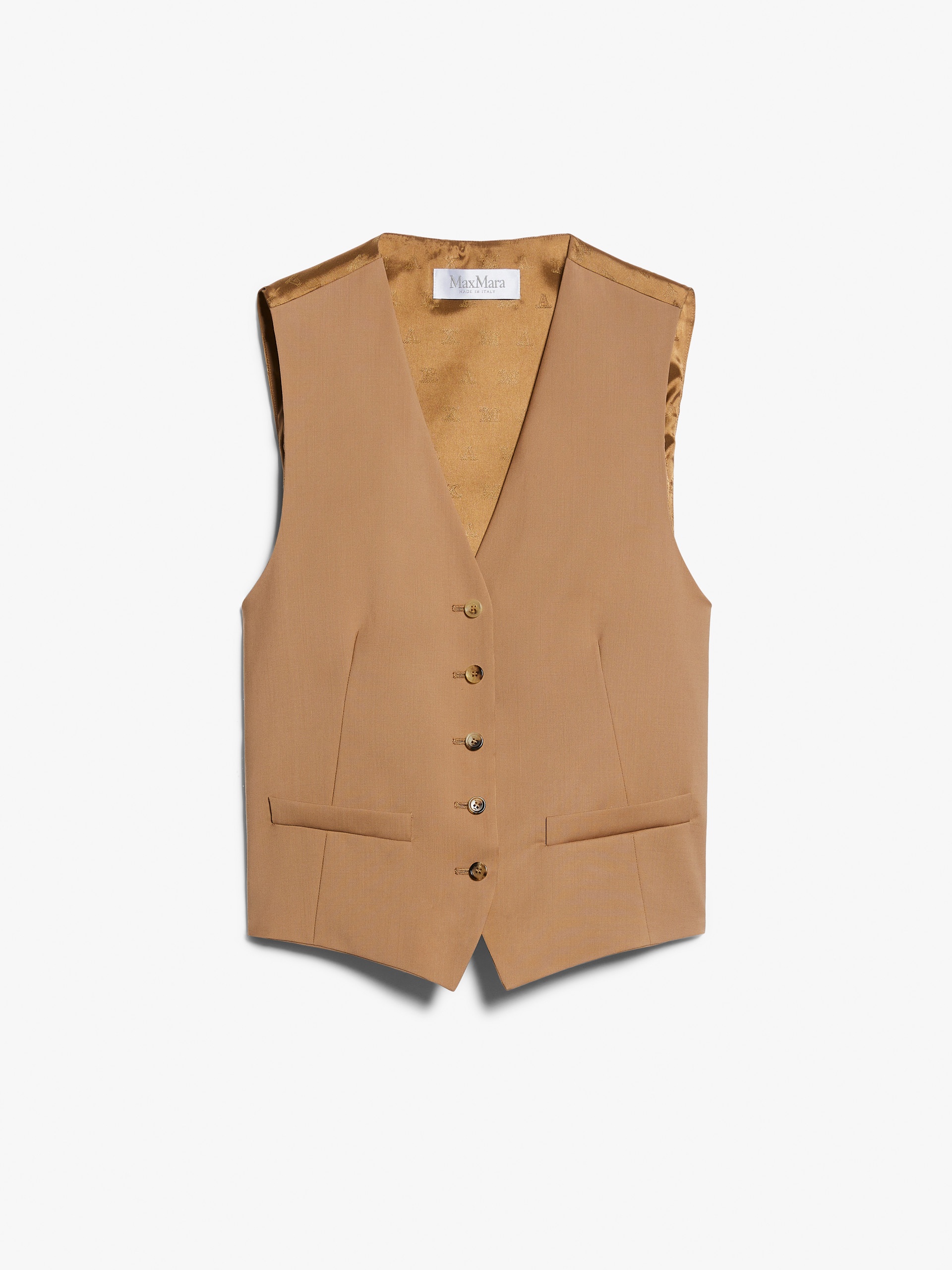 DETAILS Classic men’s-inspired waistcoat, made of lightweight pure wool canvas. The garment features a customised fabric insert on the back and an adjustable drawstring waist on the back. Features a V-neck and welt pockets. Button fastening at the front. COMPOSITION AND CARE Front 100% virgin wool; back 100% viscose; lining 100% viscose. Do not wash; do not bleach; do not tumble dry; cool iron; professionally dry clean perchloroethylene - mild process; do not wet clean.; wash the garment while it is fastened.; do not iron the buttons.; protect buttons before washing.; protect the ends stoppers and/or the cord ends before washing.; turn the articles inside out before washing.; contains non-textile parts of animal origin. Distributed by Max Mara S.r.l., registered office in Reggio Emilia (Italy), Via Giulia Maramotti 4, 42124 (IT)